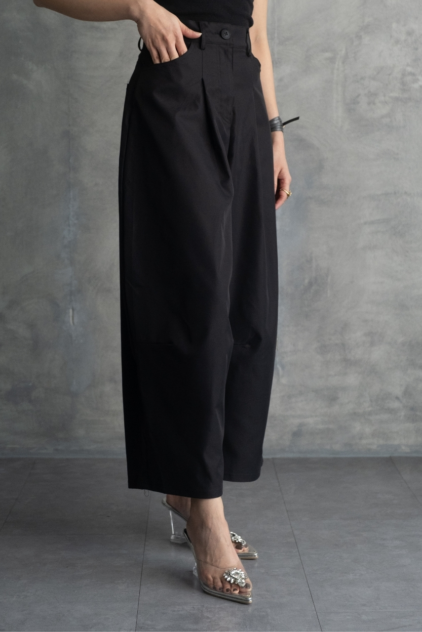 Material: Semi Wool Cotton High-waisted barrel-shaped leg, featuring clean front with subtle pleats Comes with side pockets, front zip and metal hook fastening
