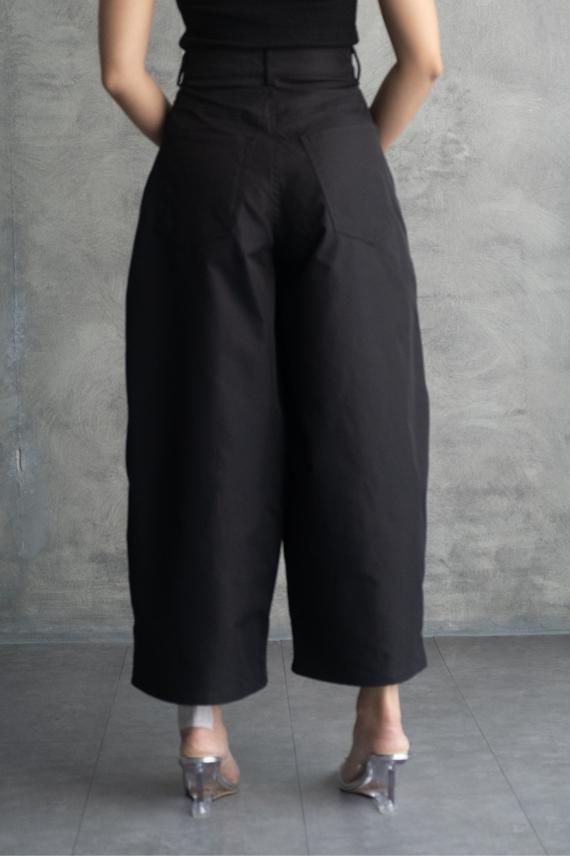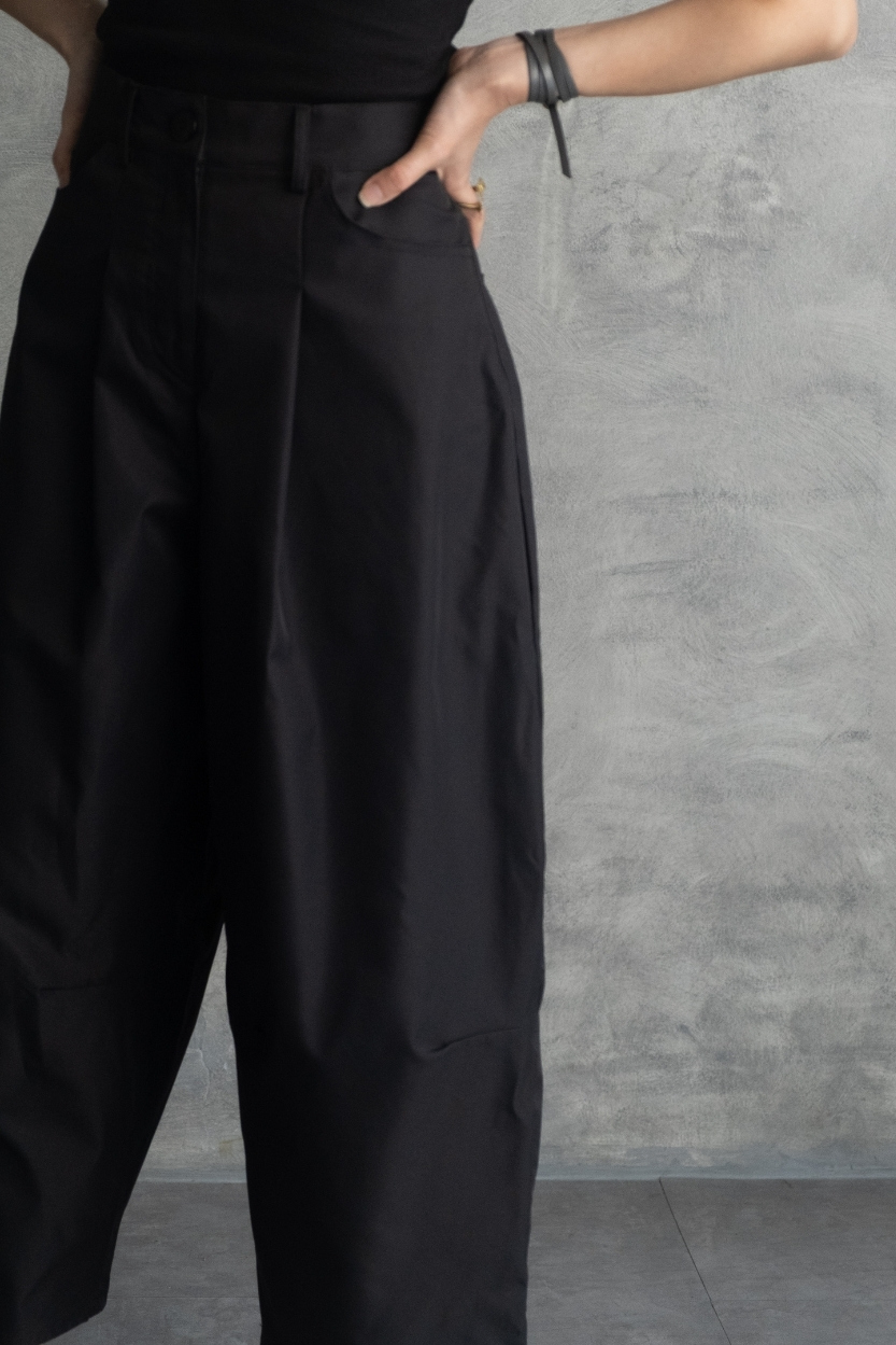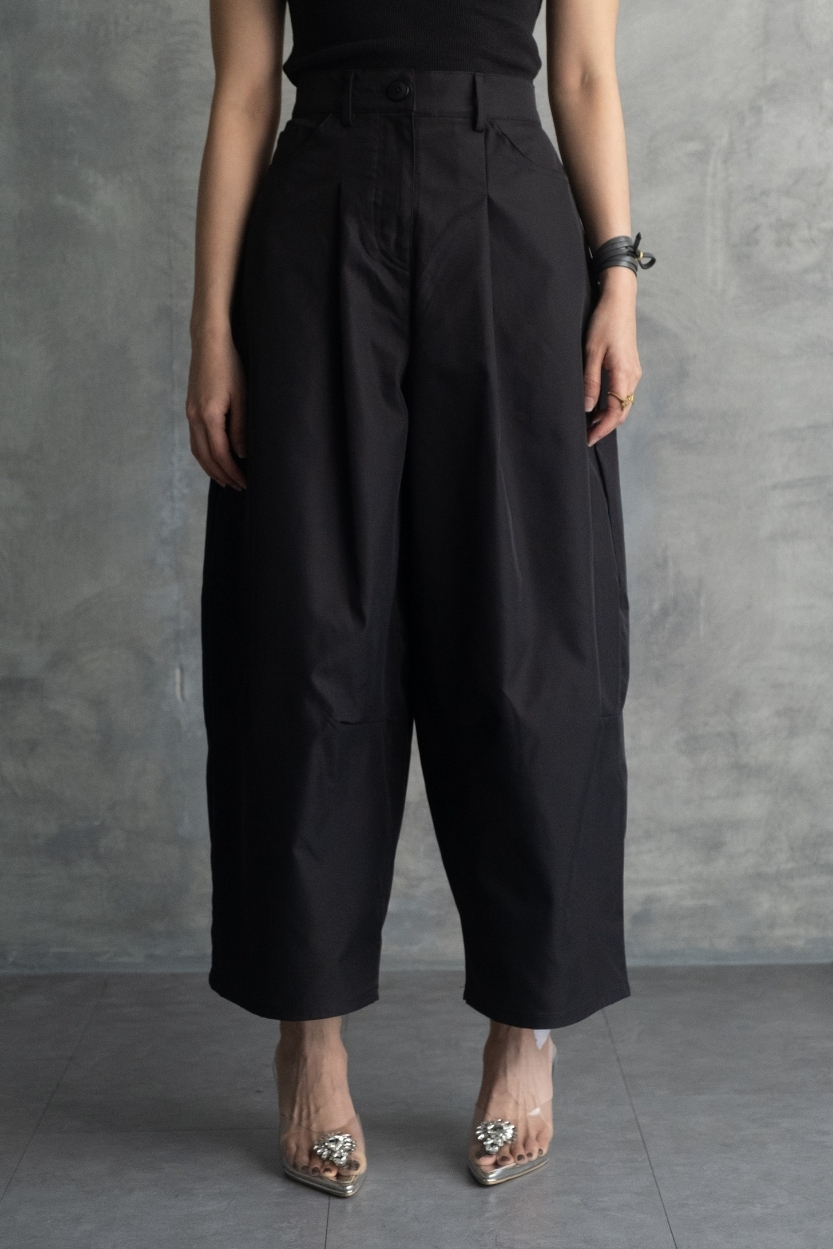 Material: Semi Wool Cotton High-waisted barrel-shaped leg, featuring clean front with subtle pleats Comes with side pockets, front zip and metal hook fastening