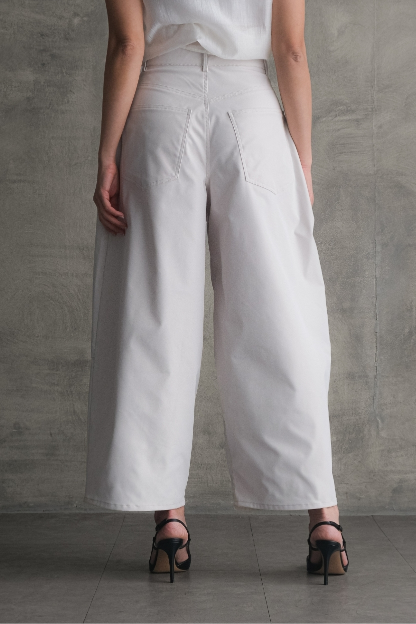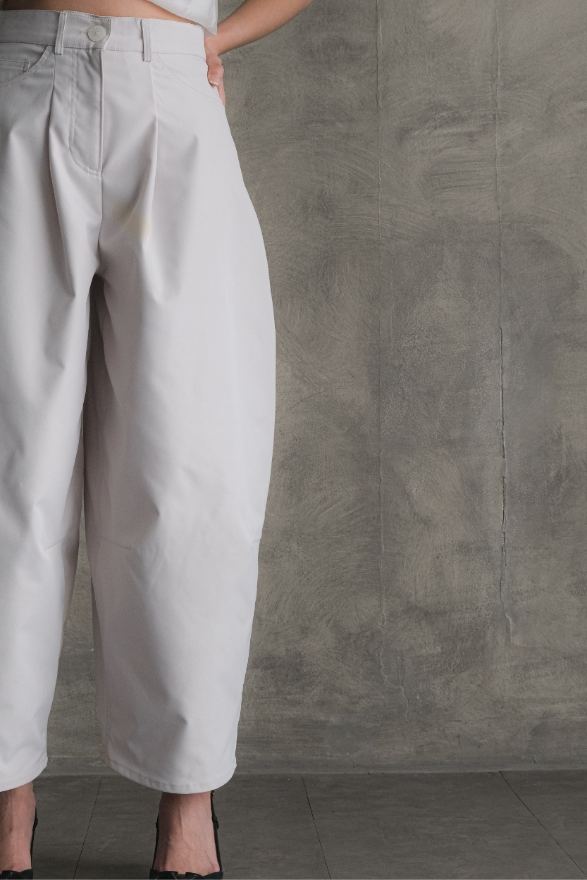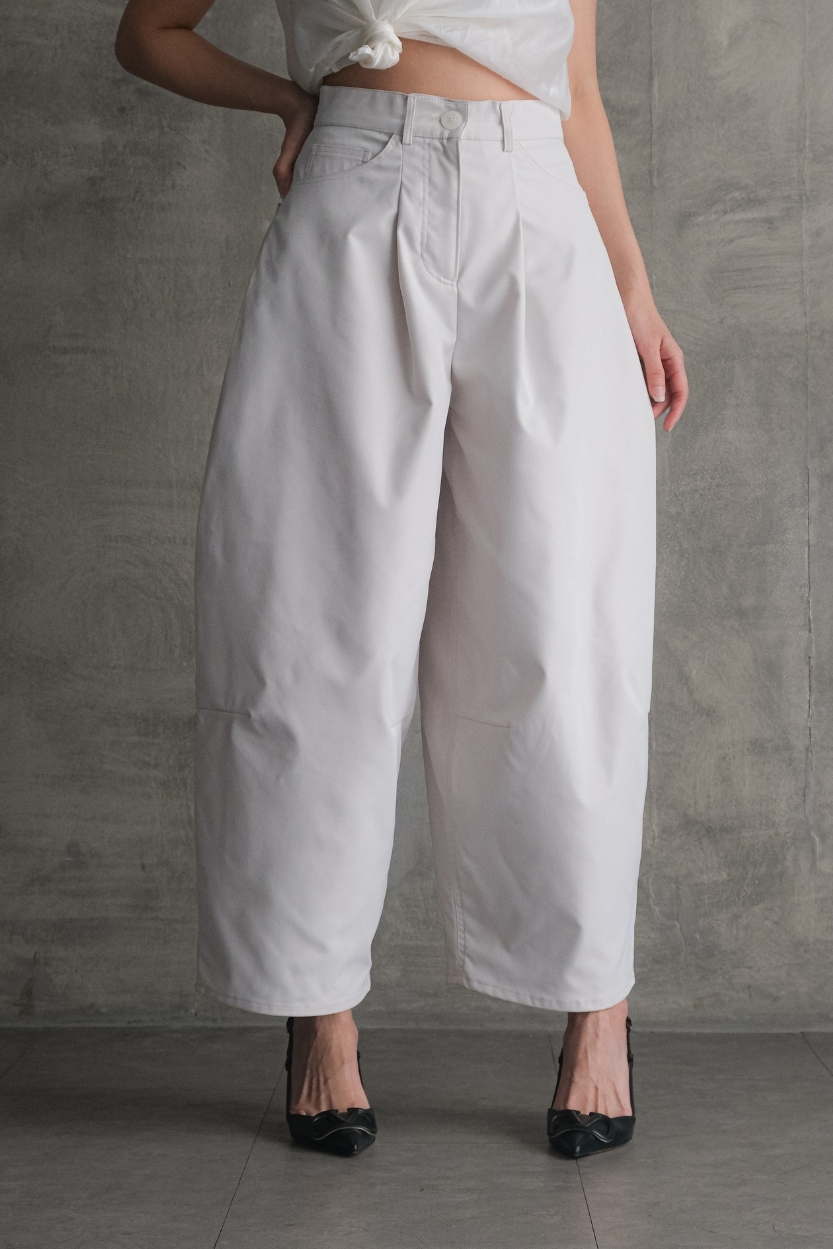 Material: Semi Wool Cotton High-waisted barrel-shaped leg, featuring clean front with subtle pleats Comes with side pockets, front zip and metal hook fastening