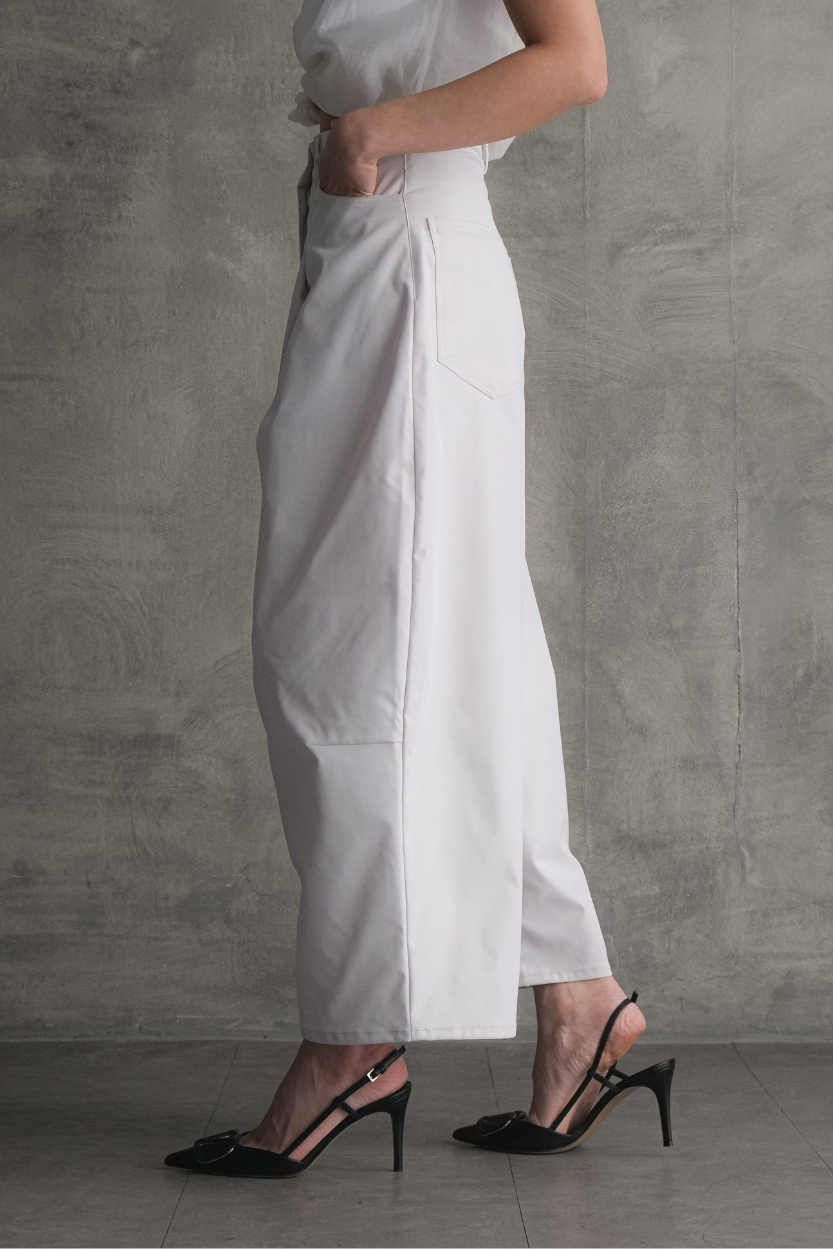 Material: Semi Wool Cotton High-waisted barrel-shaped leg, featuring clean front with subtle pleats Comes with side pockets, front zip and metal hook fastening