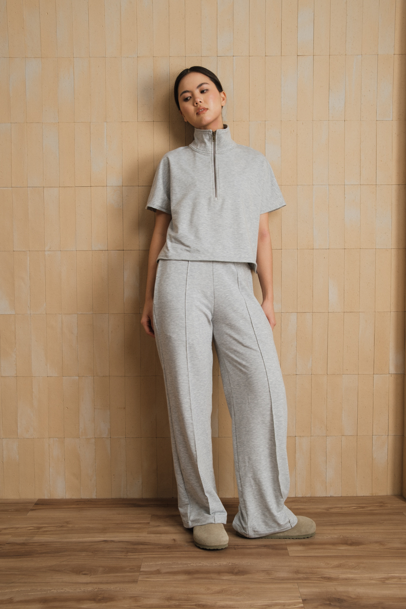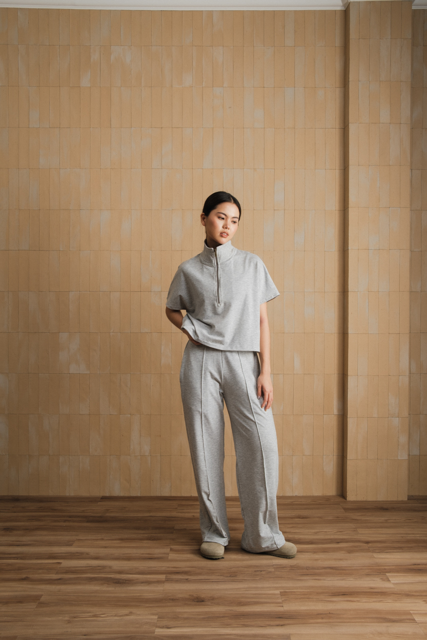 Top with quarter zipper up closure, matching trousers