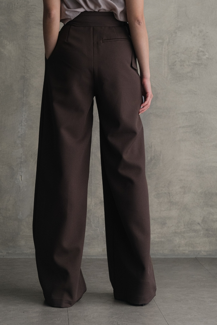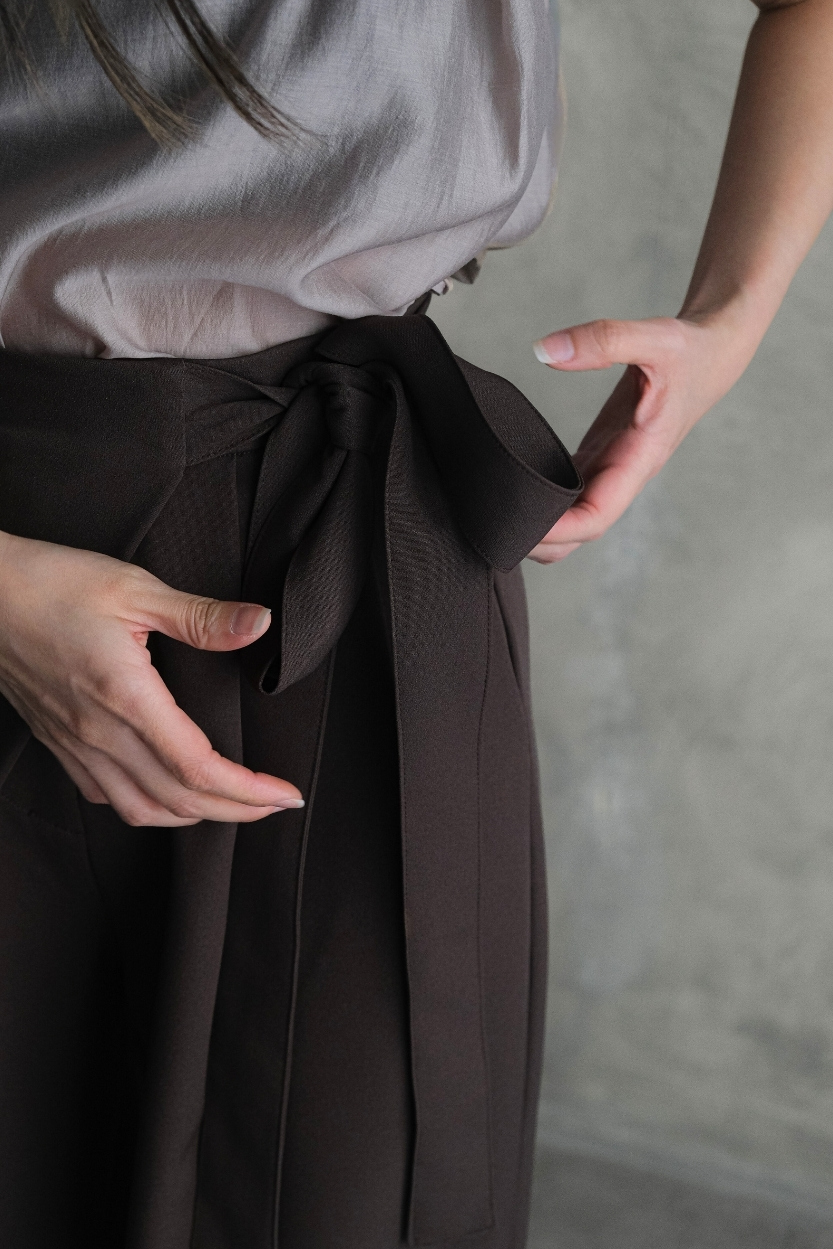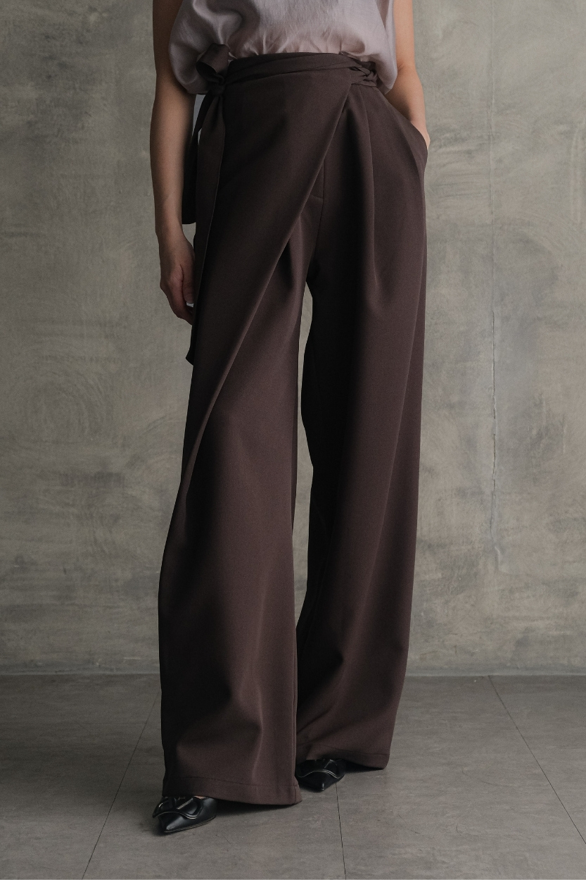 High-waisted wide leg, featuring a wrap-front shape that ties at the waist