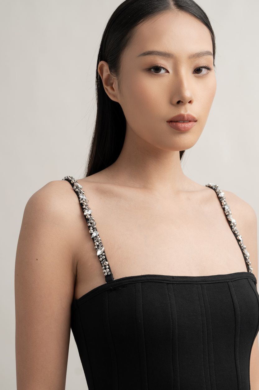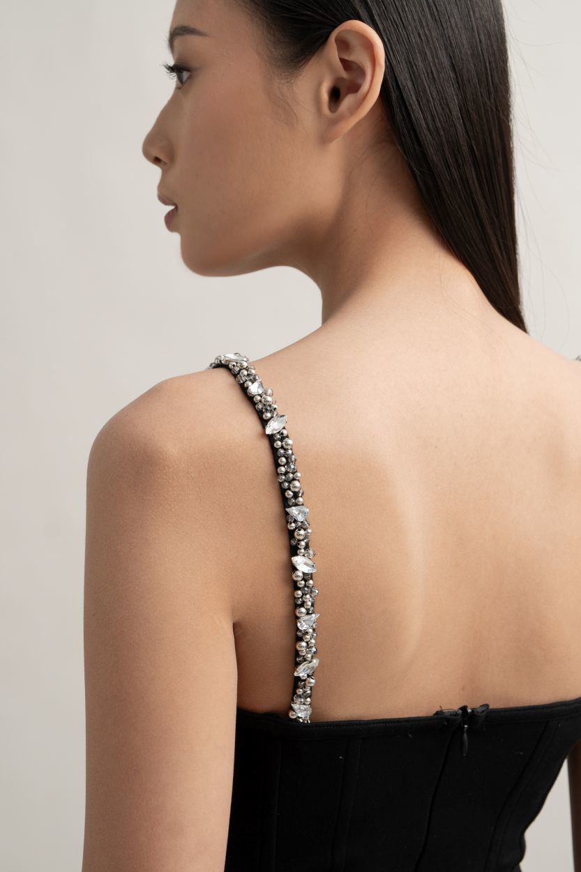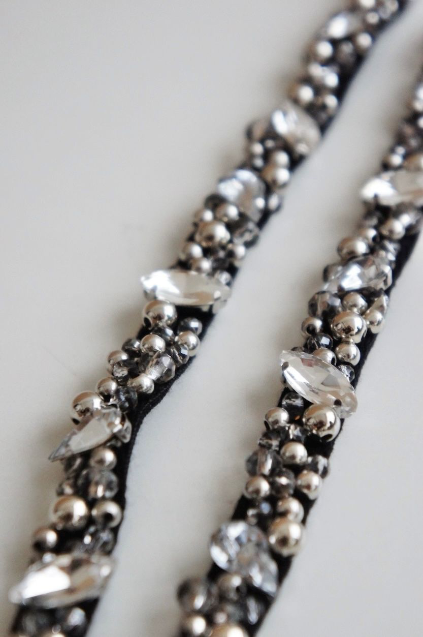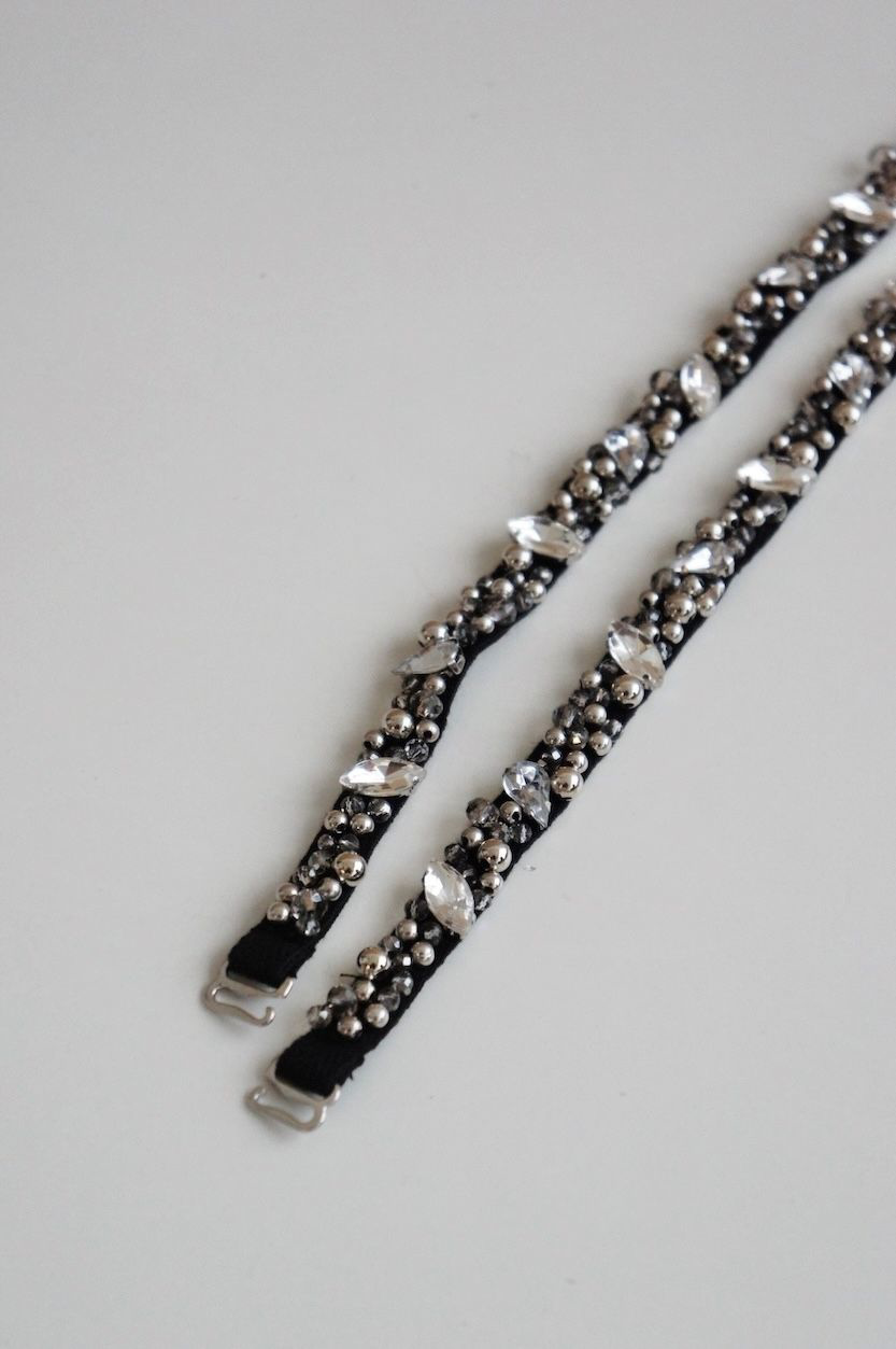 Material: Straps made of cotton with synthetic beads and pearls hand-sewed to the straps.