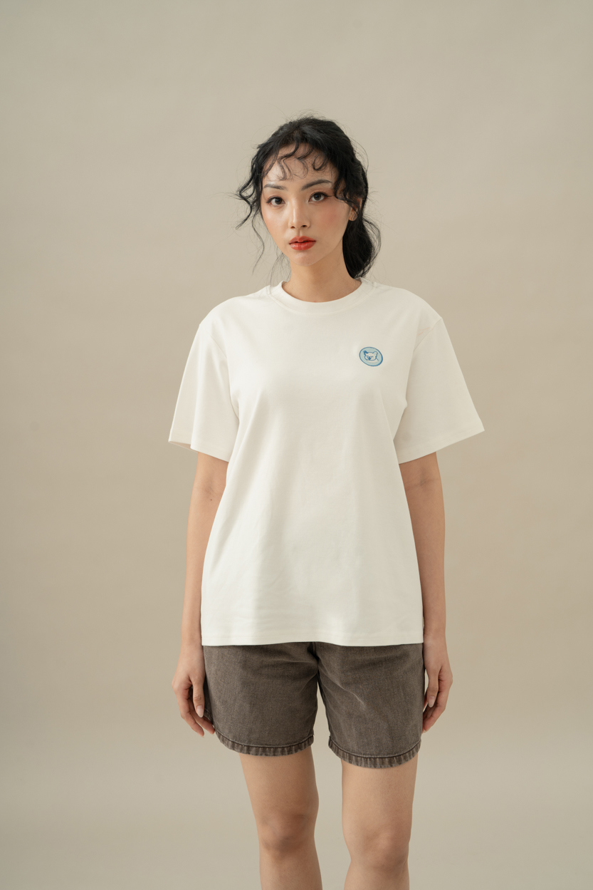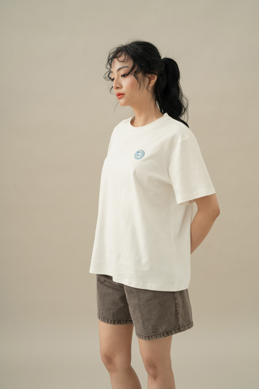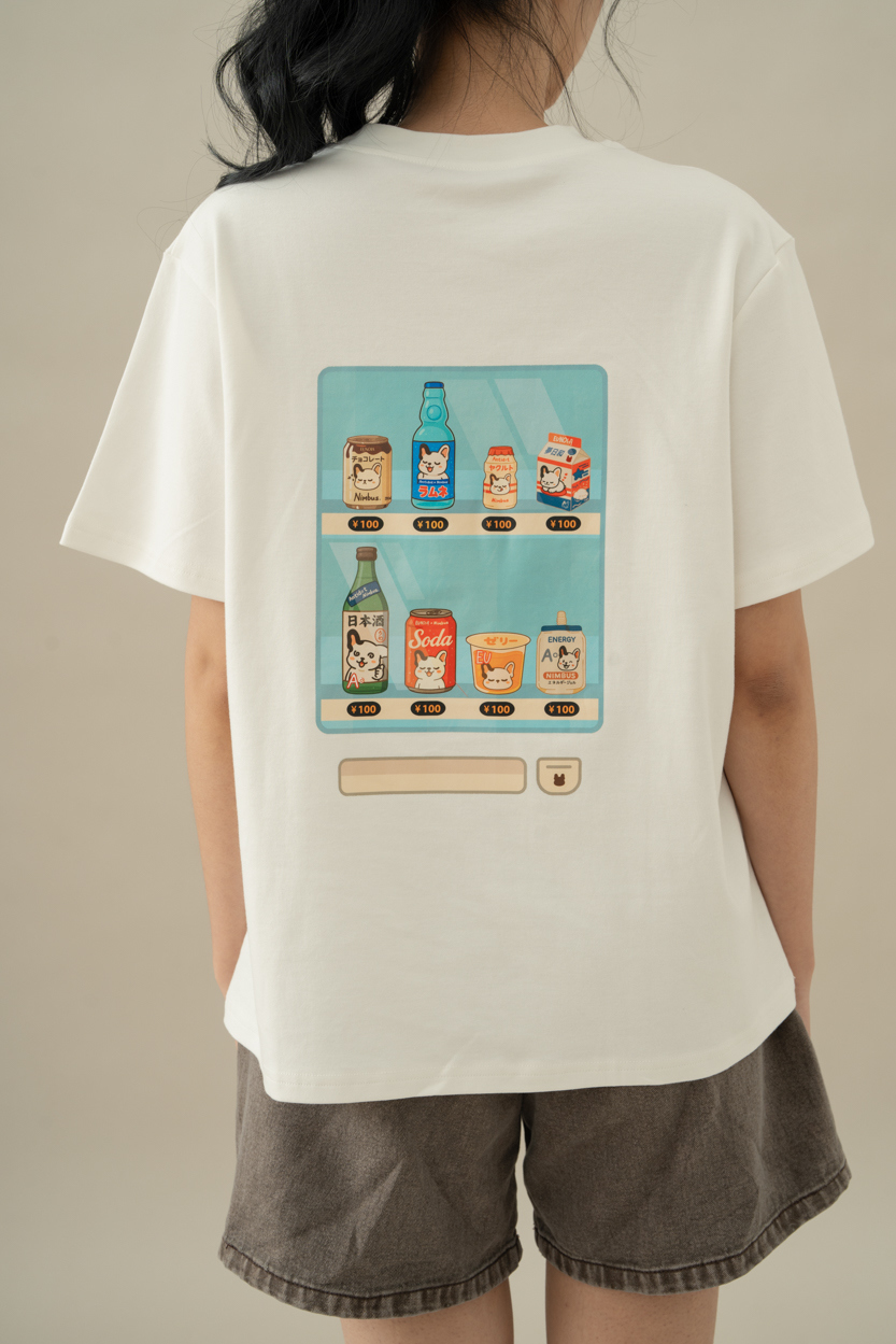 Material: Cotton Air Oversized round neck white t-shirtfeaturing embroidery of nimbus coin in front andand print of nimbus vending machine at the back