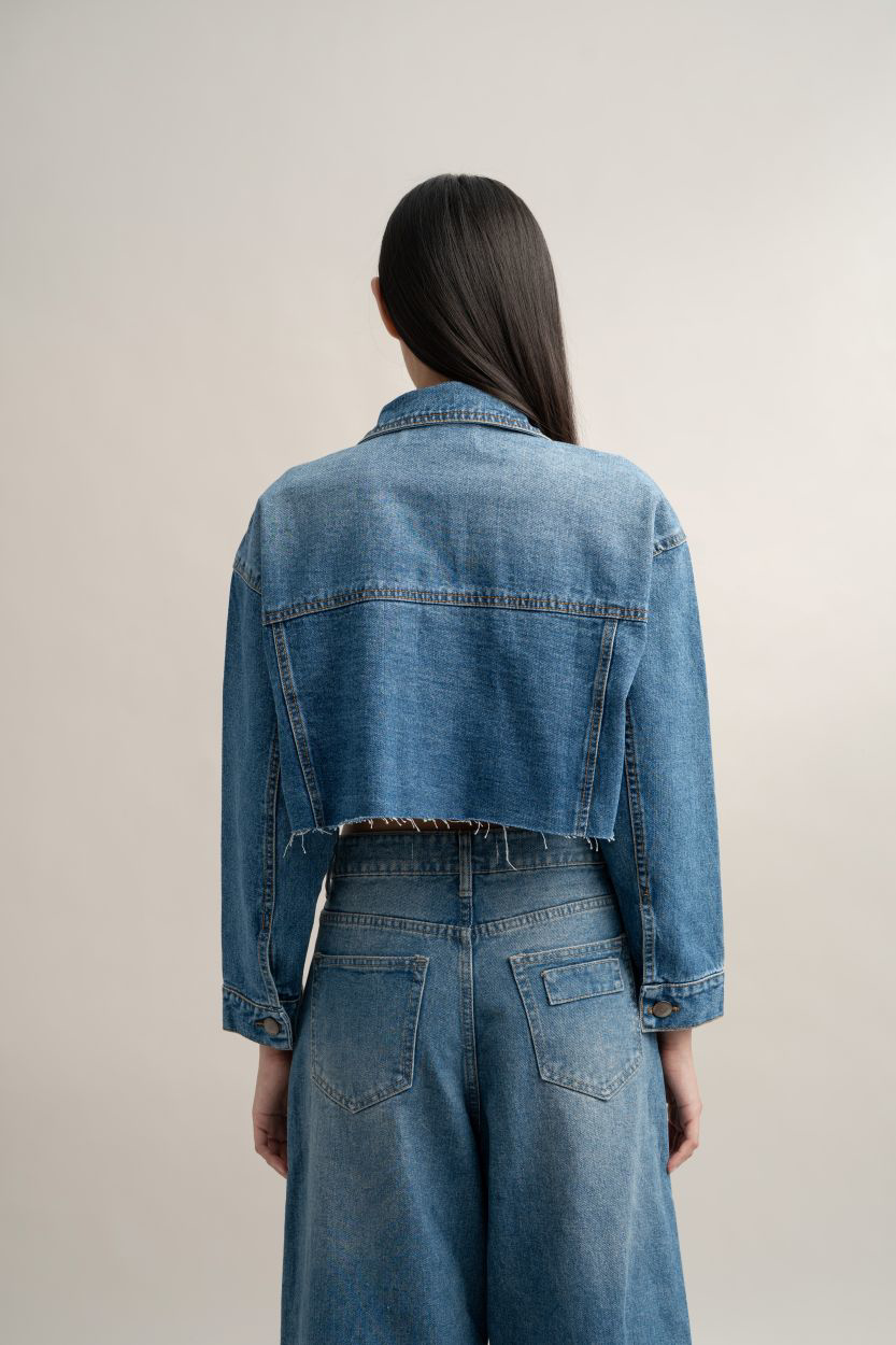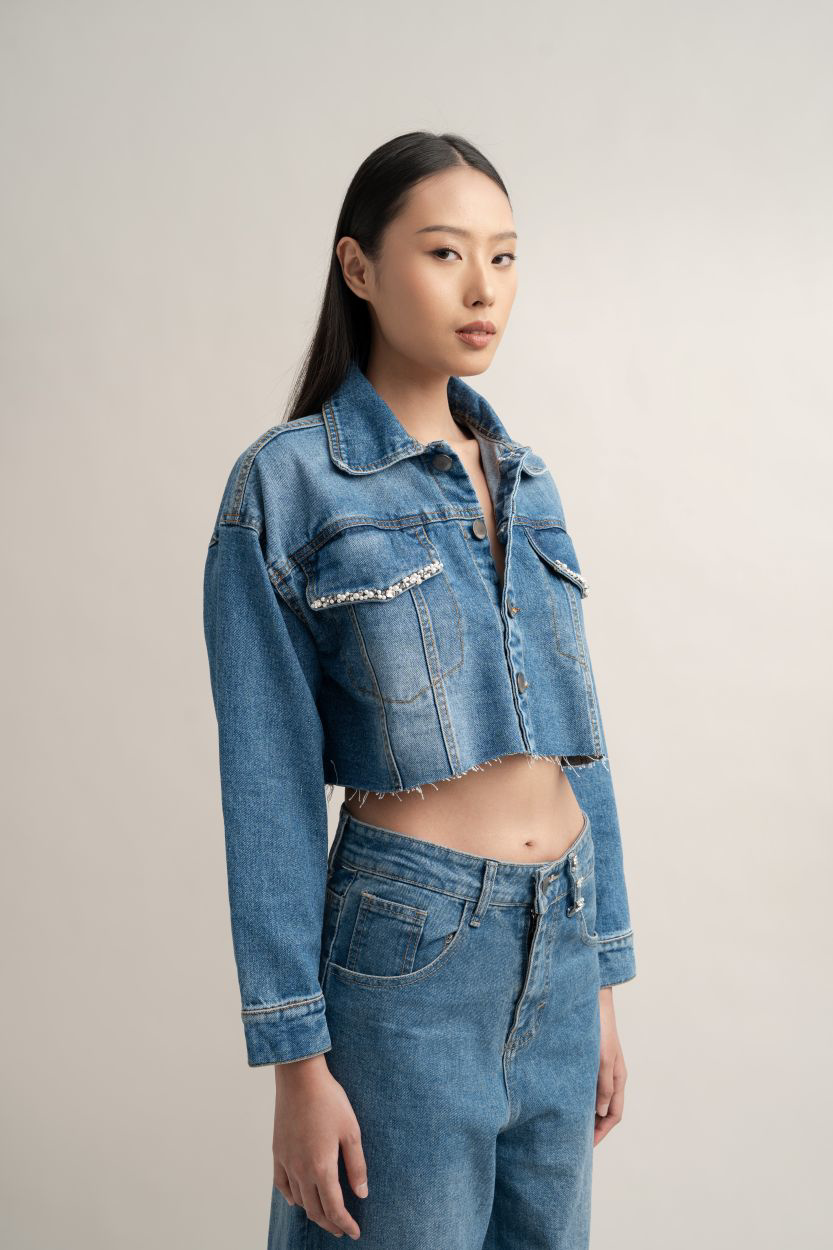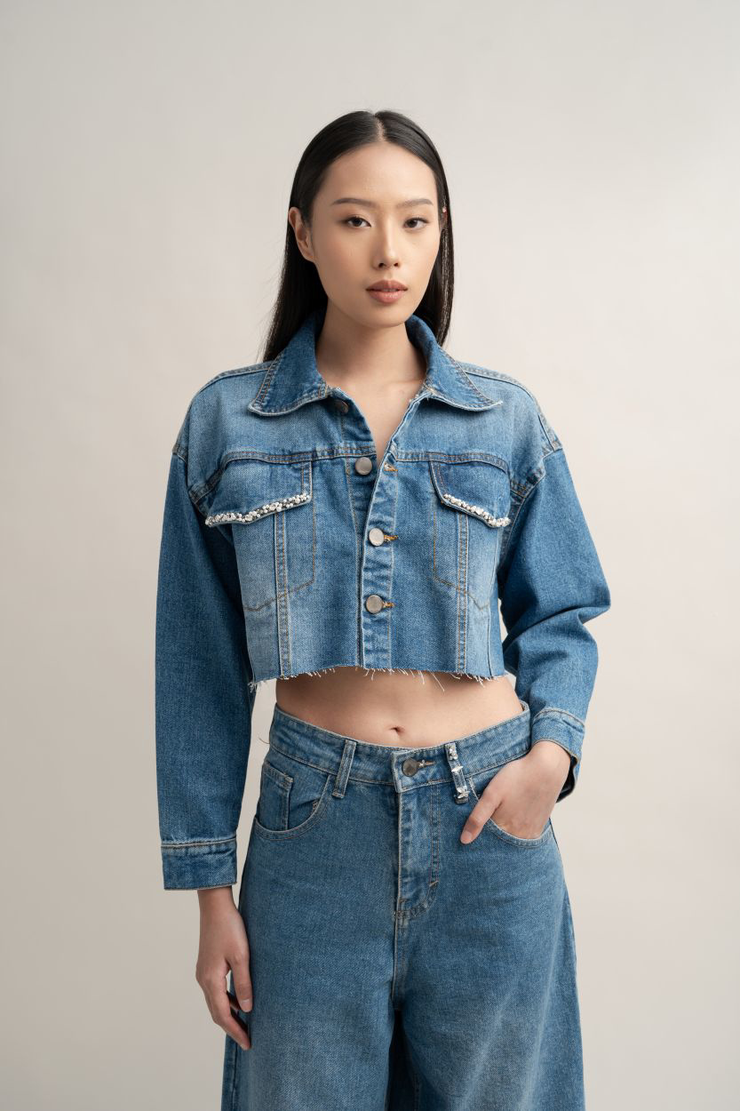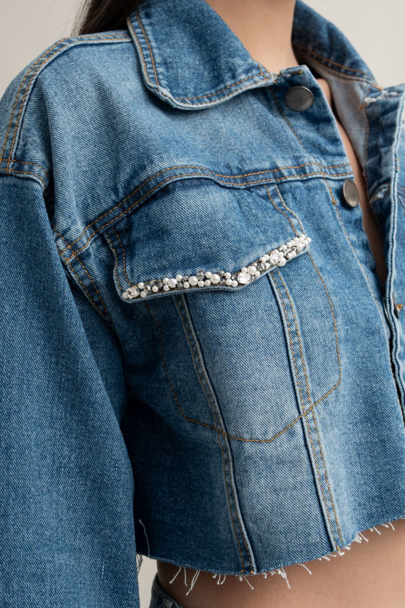 Material: Jeans Cropped denim jacket with raw-cut hem finish,featuring crystal-trim detailing on the chest pocketsand front button closure