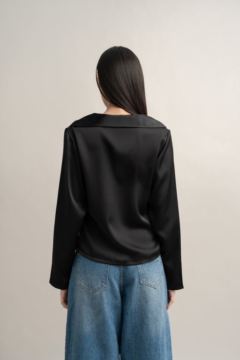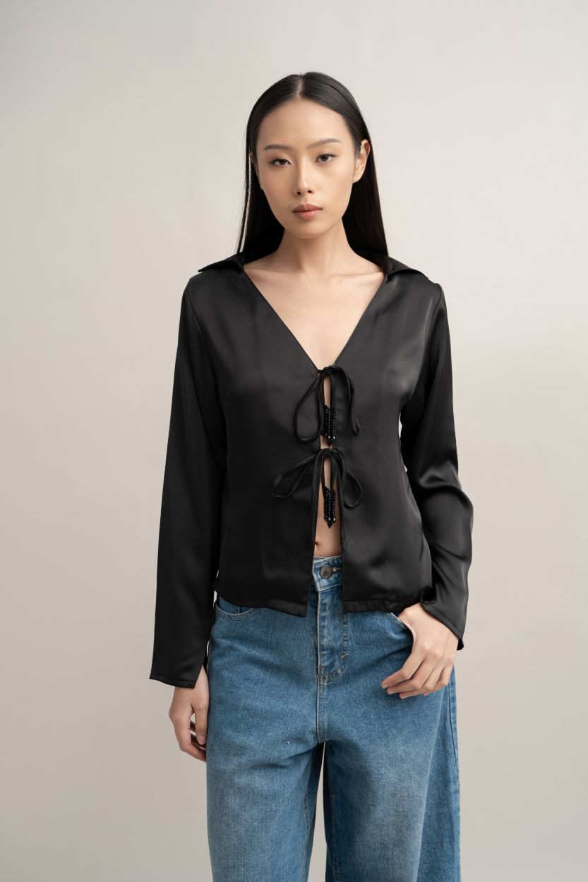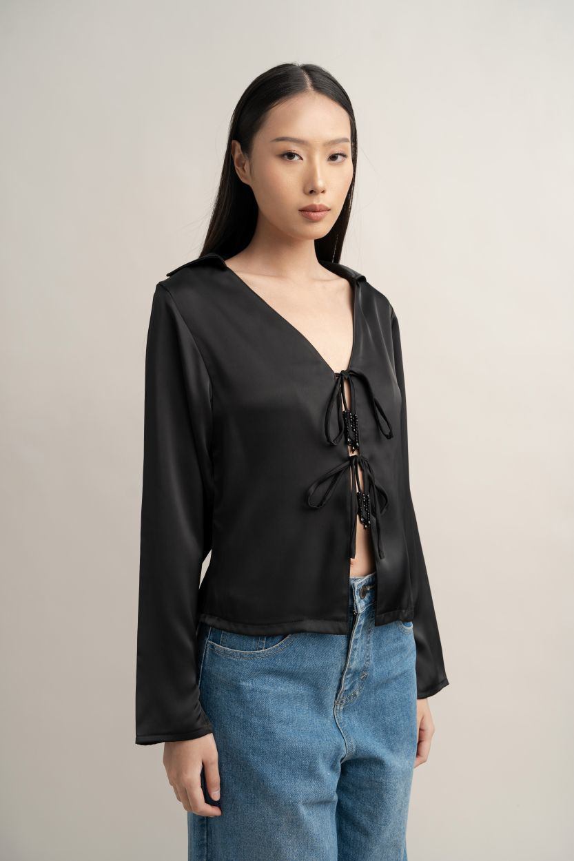 Material: Mirage Cotton Satin V-neckline long sleeves shirt with a relaxed fit,accentuated by front tie details,finished with delicate beaded ends that add a subtle sparkle