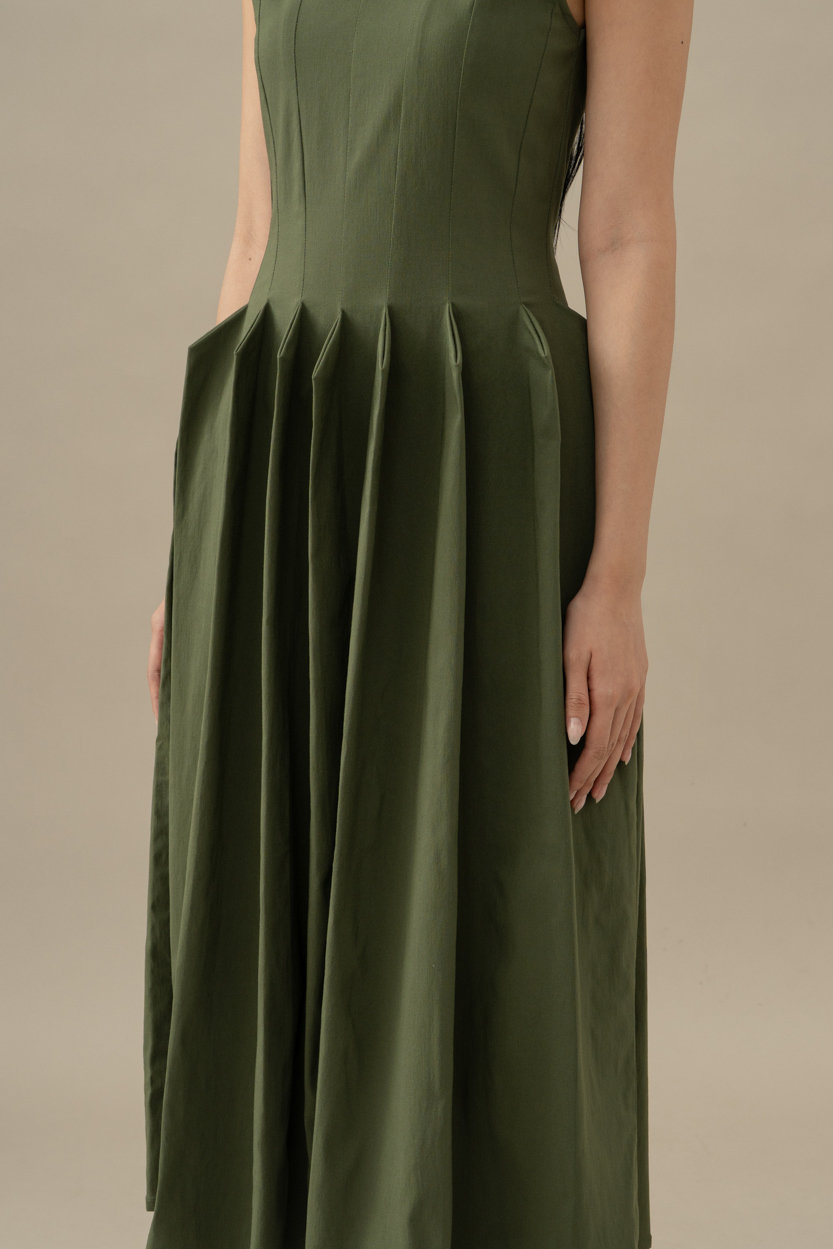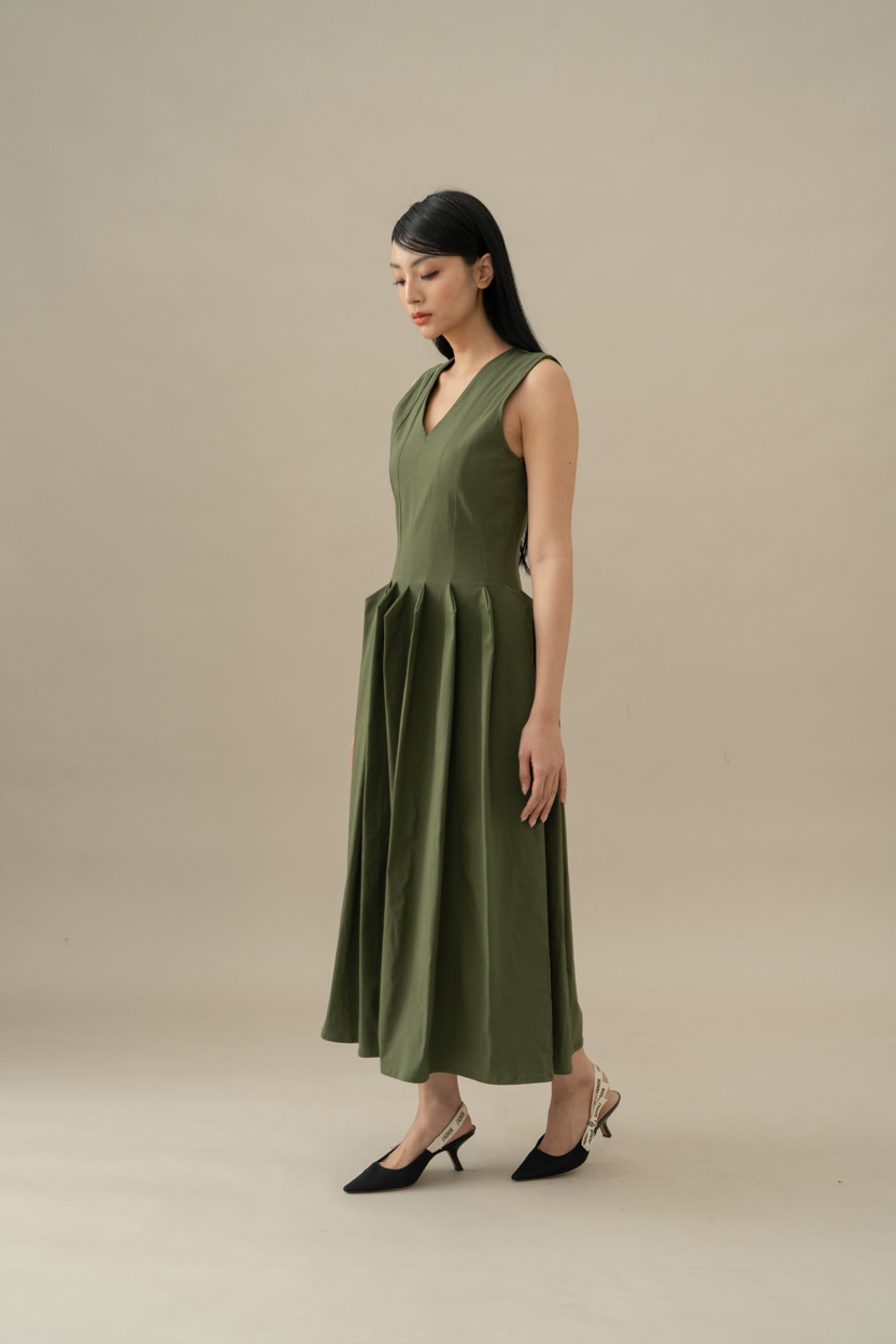 Material: Twill Stretch Classic V-neck pleated dress with a fitted bodicecomes with zip fastening at the back