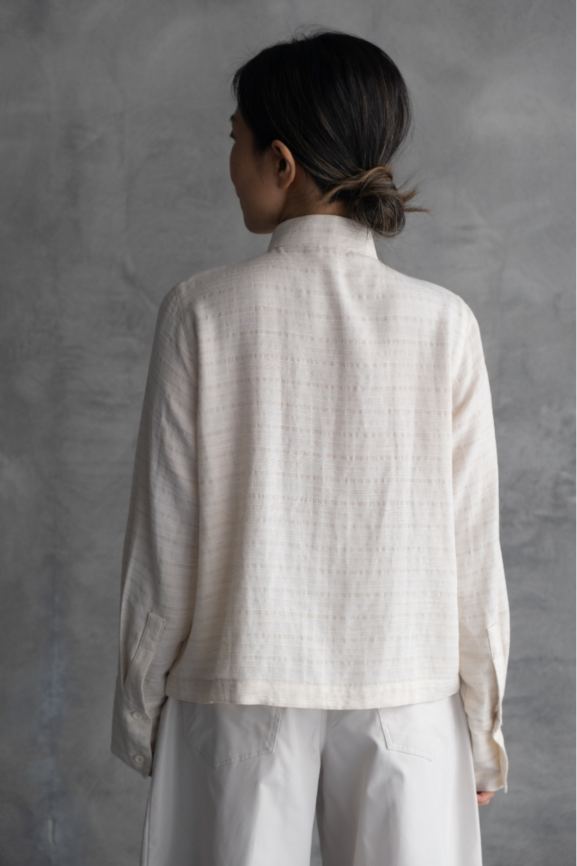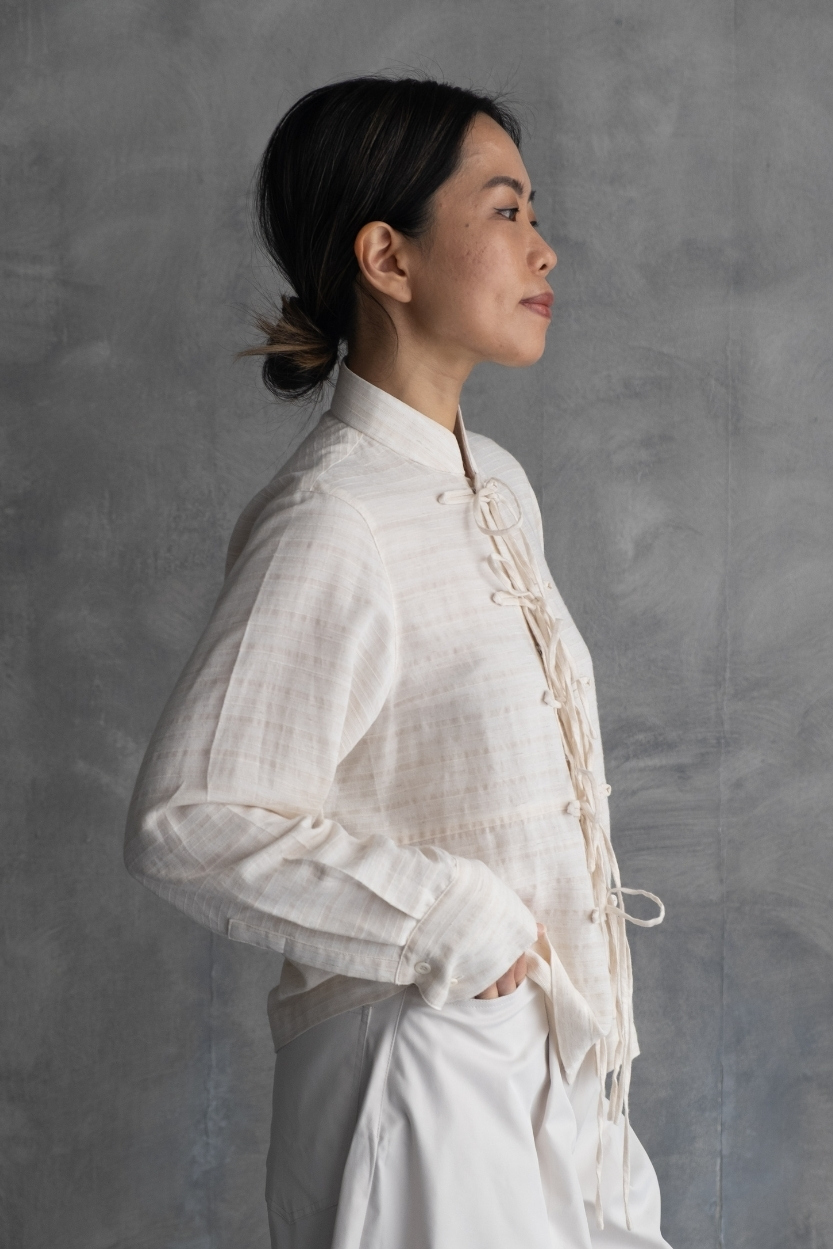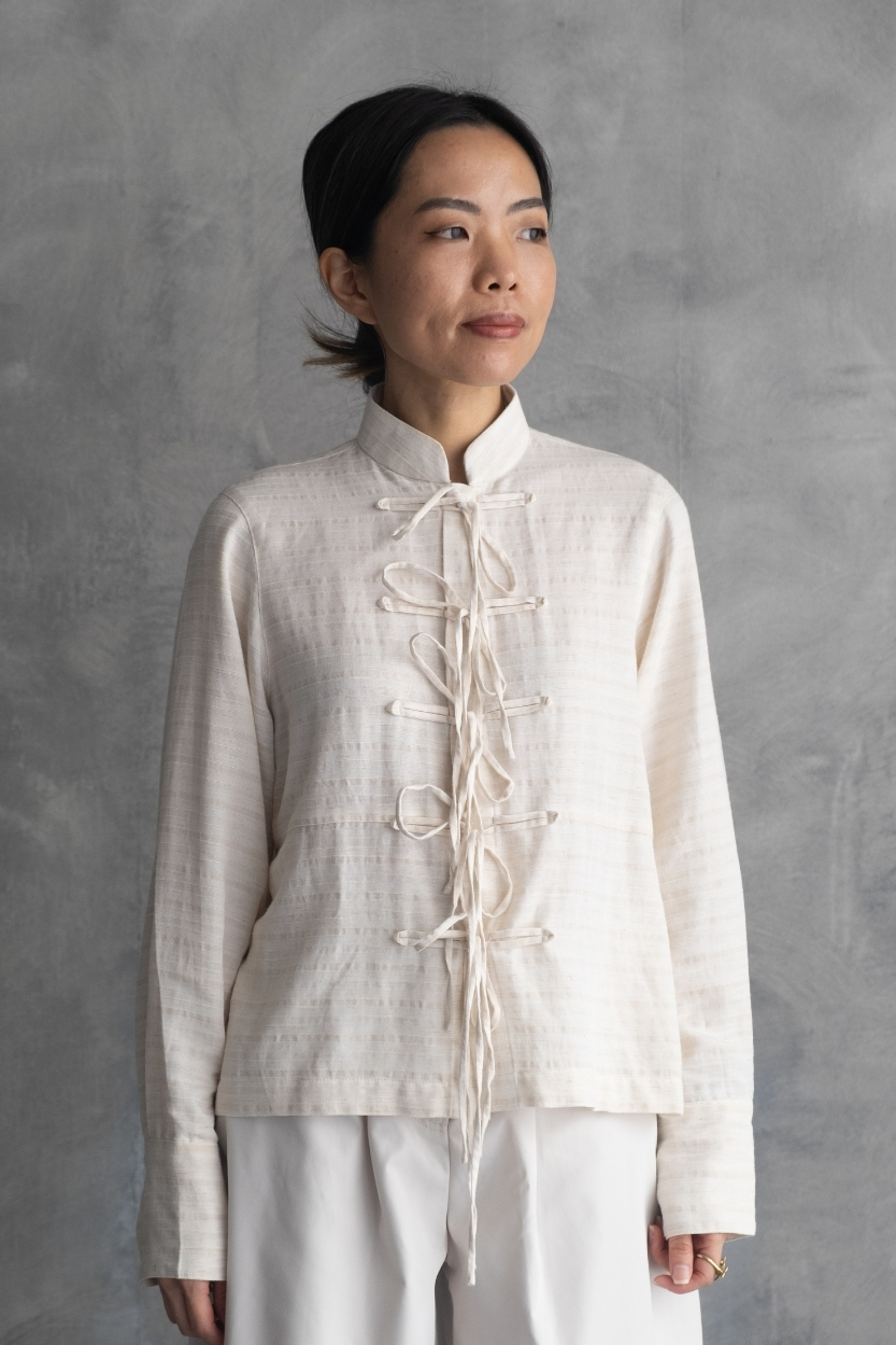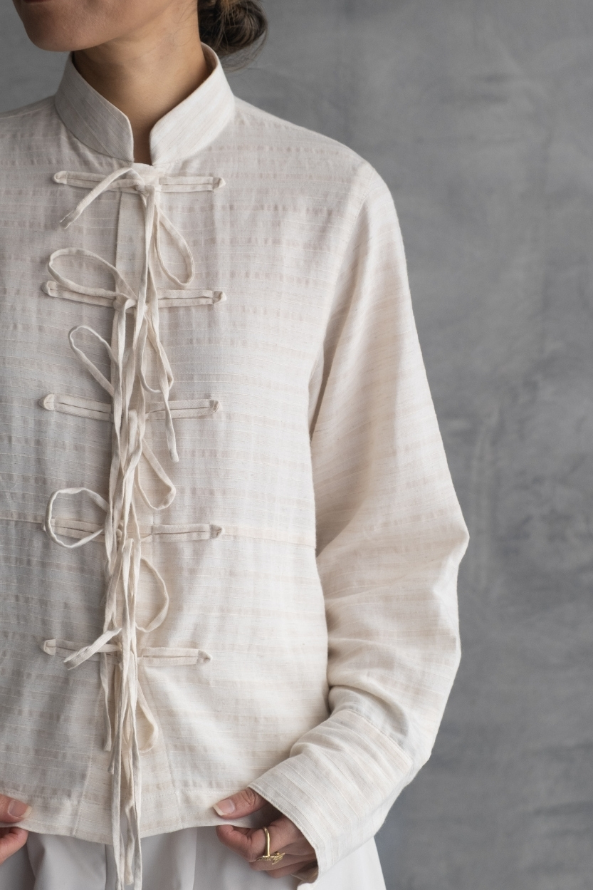 Material: Terraline Silk Lightweight long-sleeve top with structured mandarin collarand intricate hand-style rope knot closures down the front