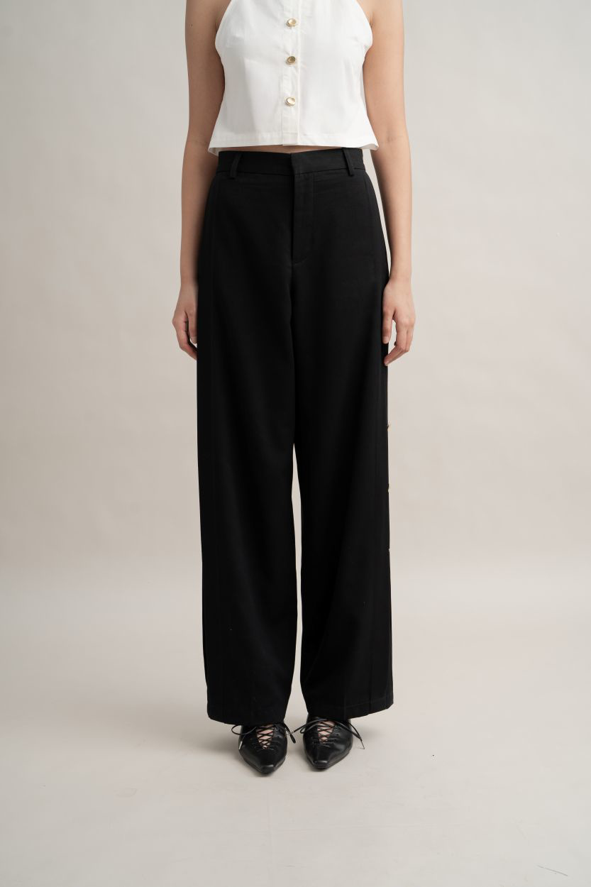 Material: Semiwool Gabardine Wide leg trousers with side custom gold buttons detailFeaturing side pockets, concealed zip and hook fastening