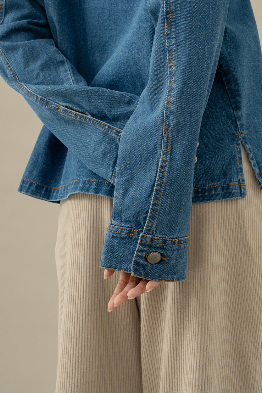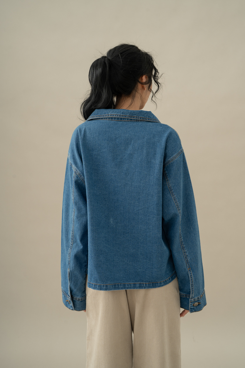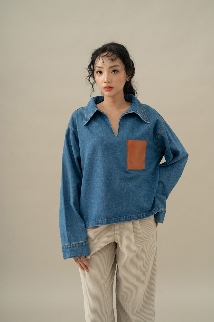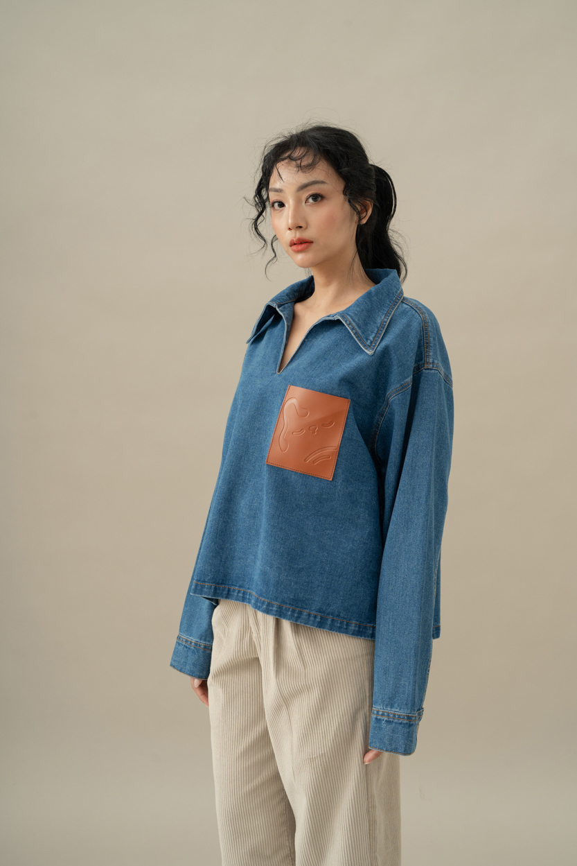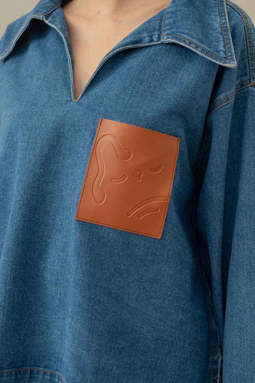 Material: Jeans Oversized denim shirt with a relaxed collar and half placket neckline featuring nimbus embossed leather pocket on the chest