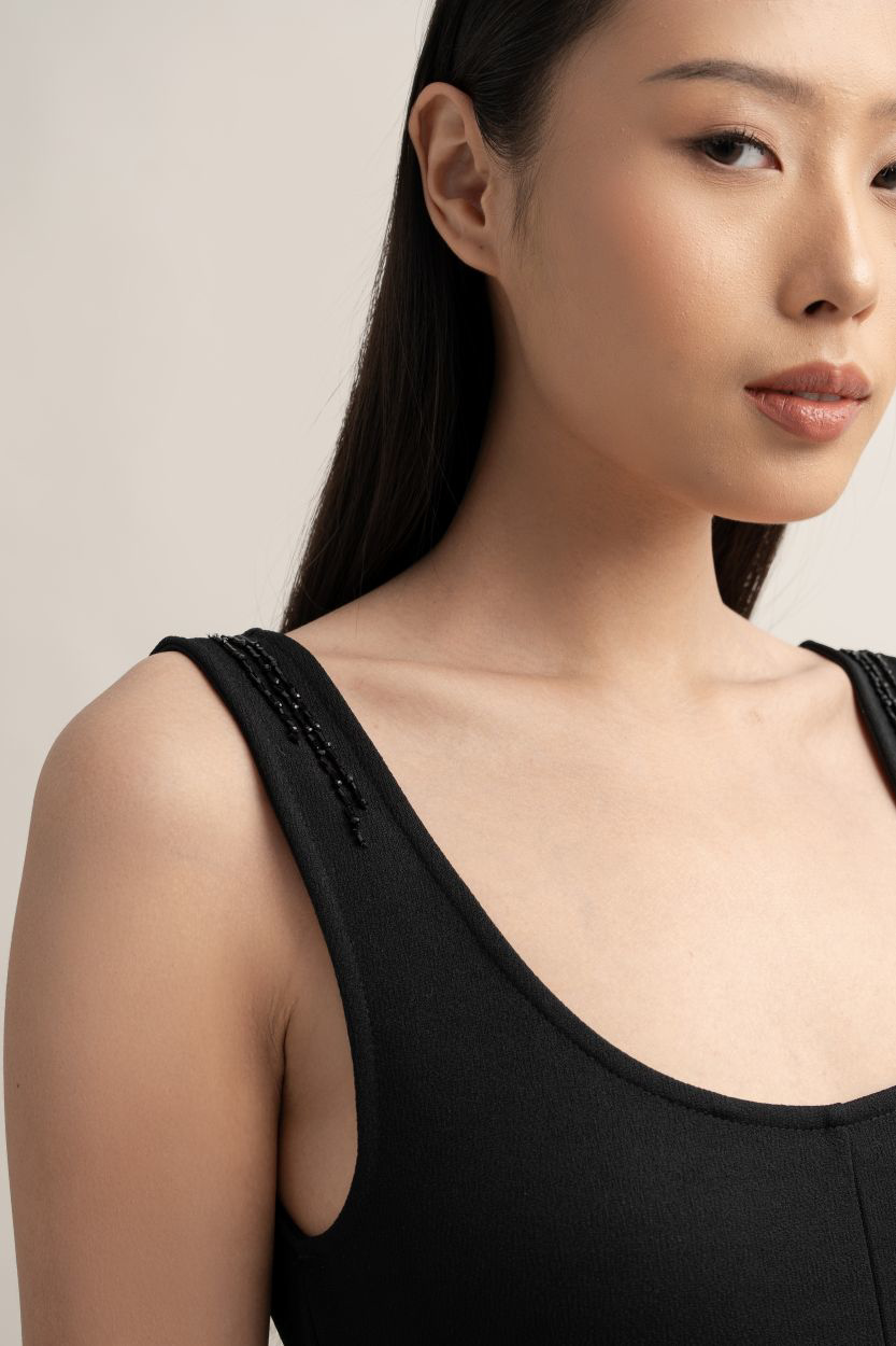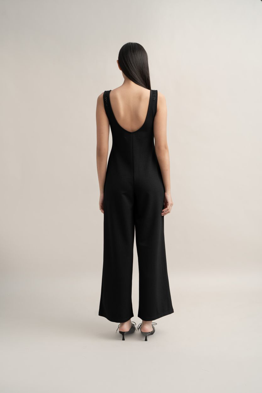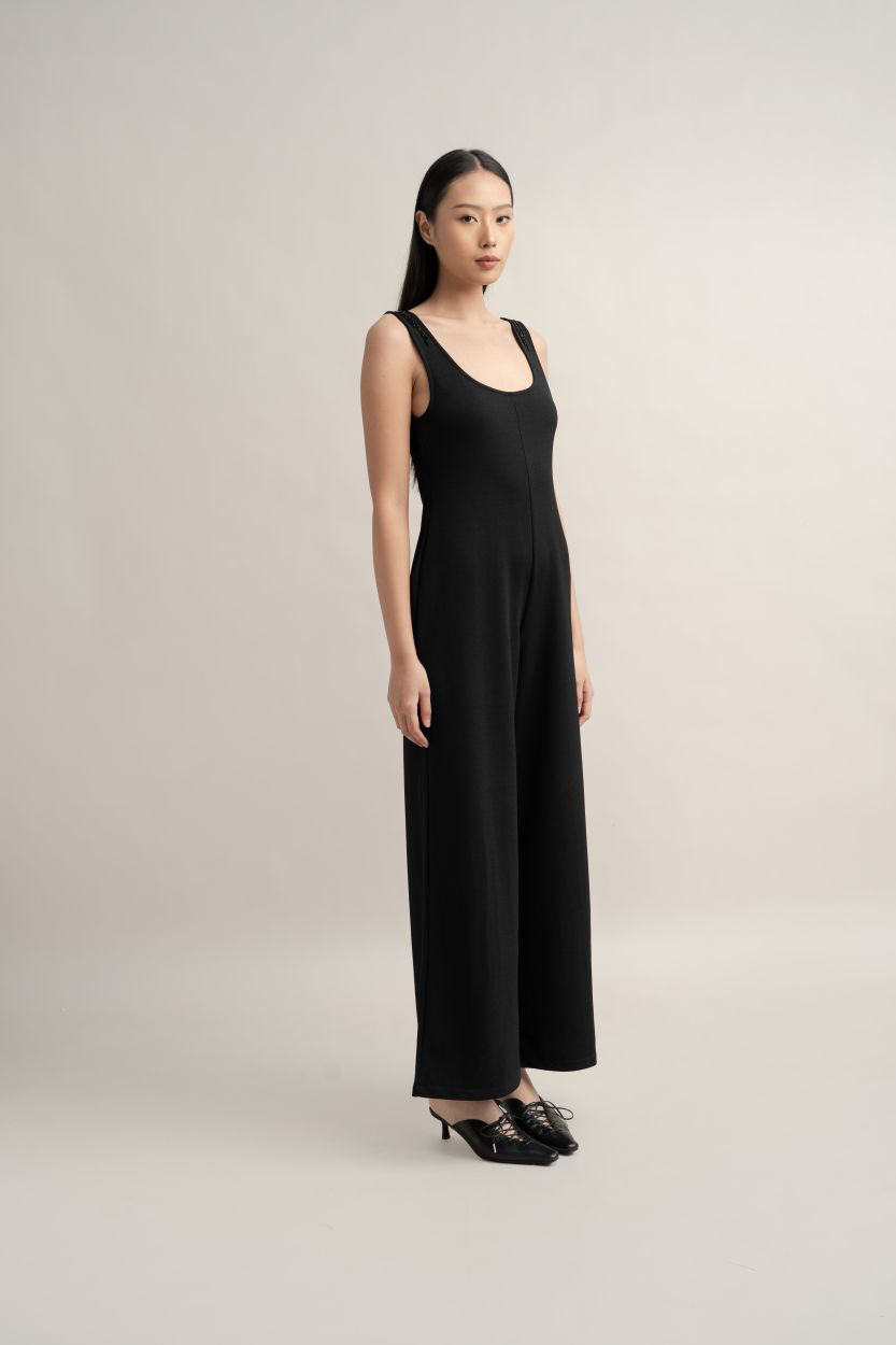 Sculpted sleeveless jumpsuit with a sleek scoop neckline,
