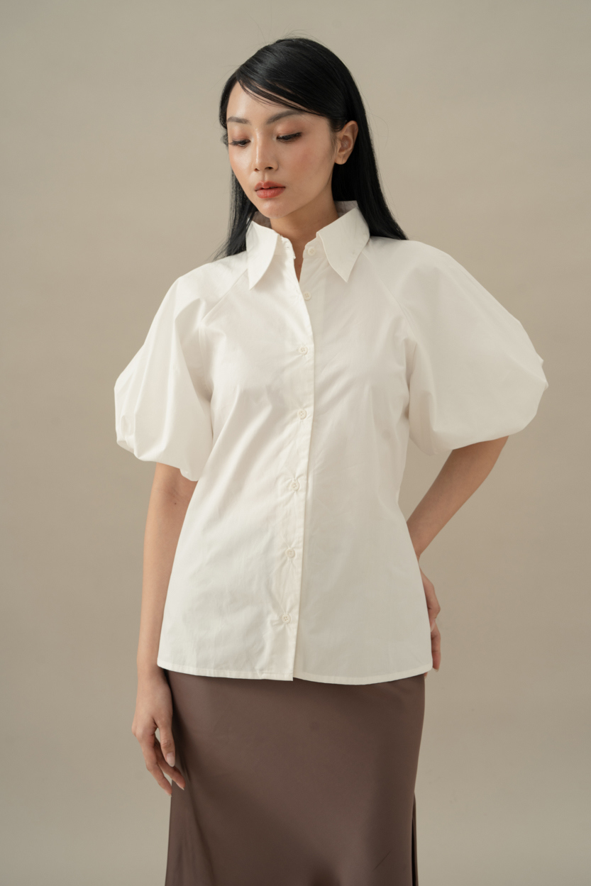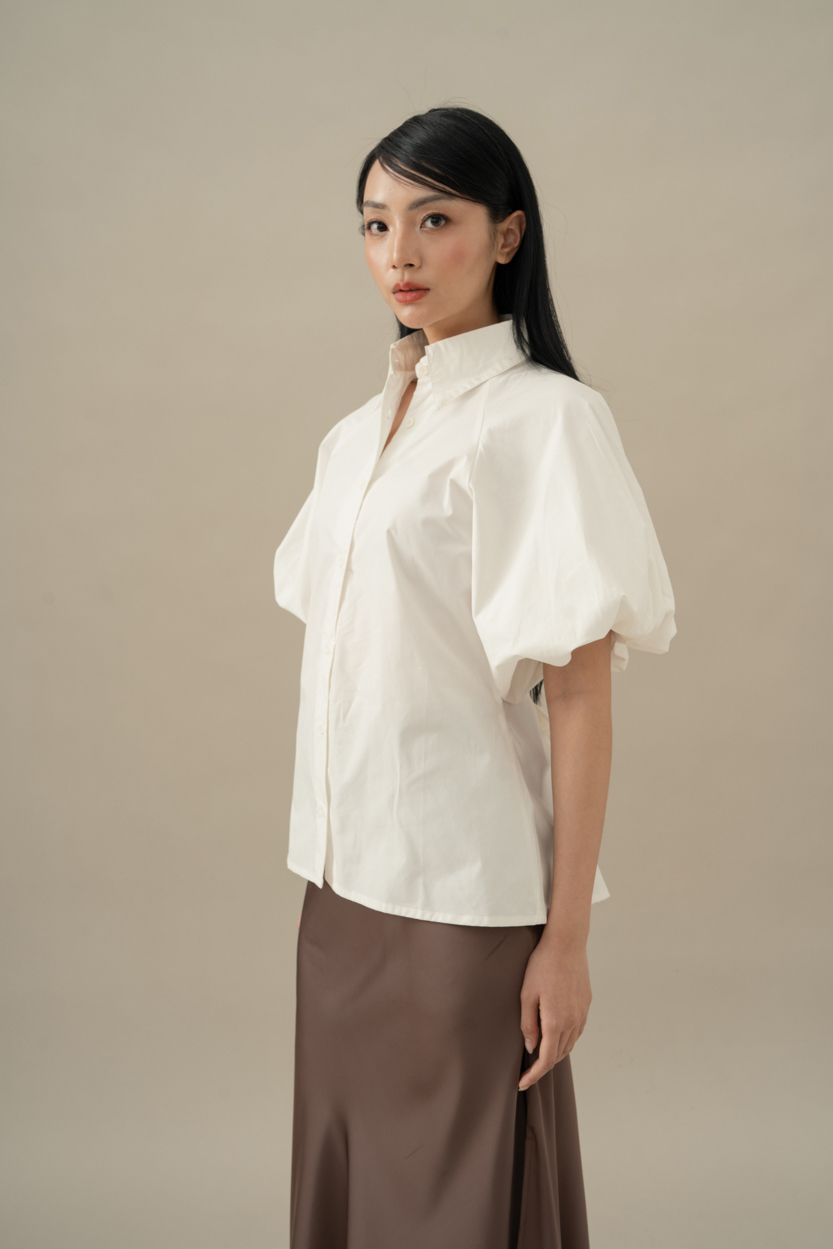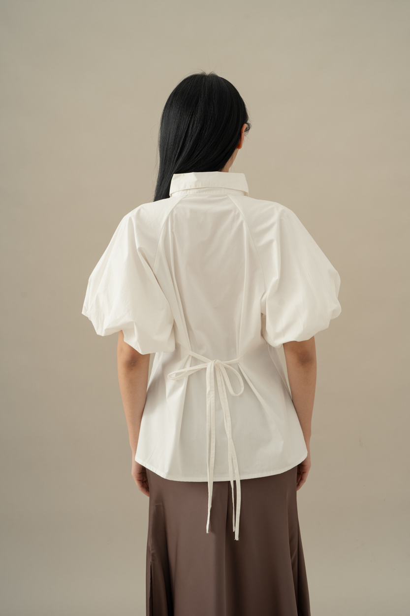 Material: Cotton Cashmere A shirt with short puffy sleeves,front fastening with buttons, comes in brown and white