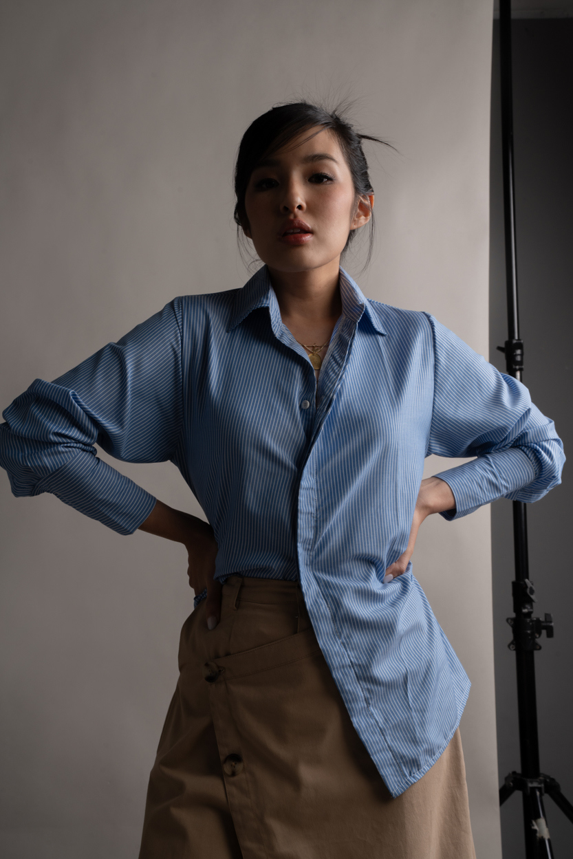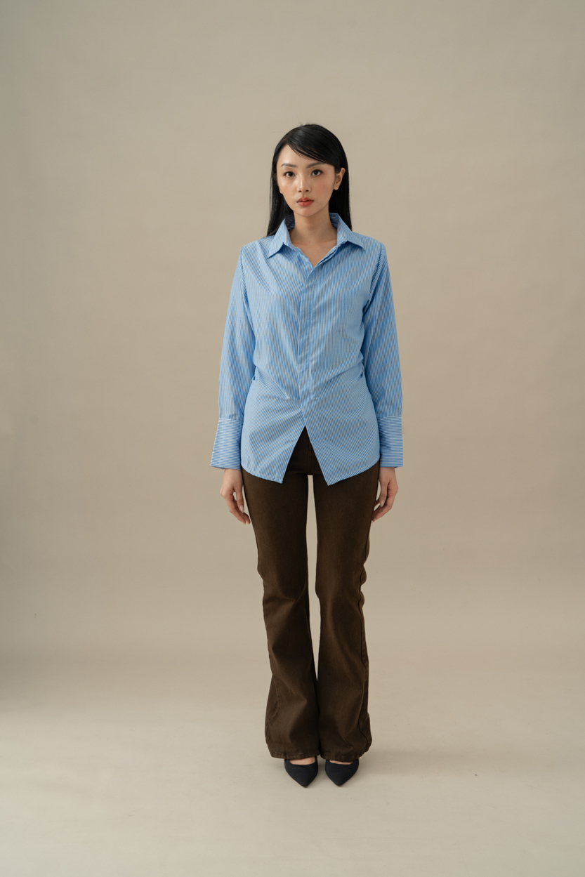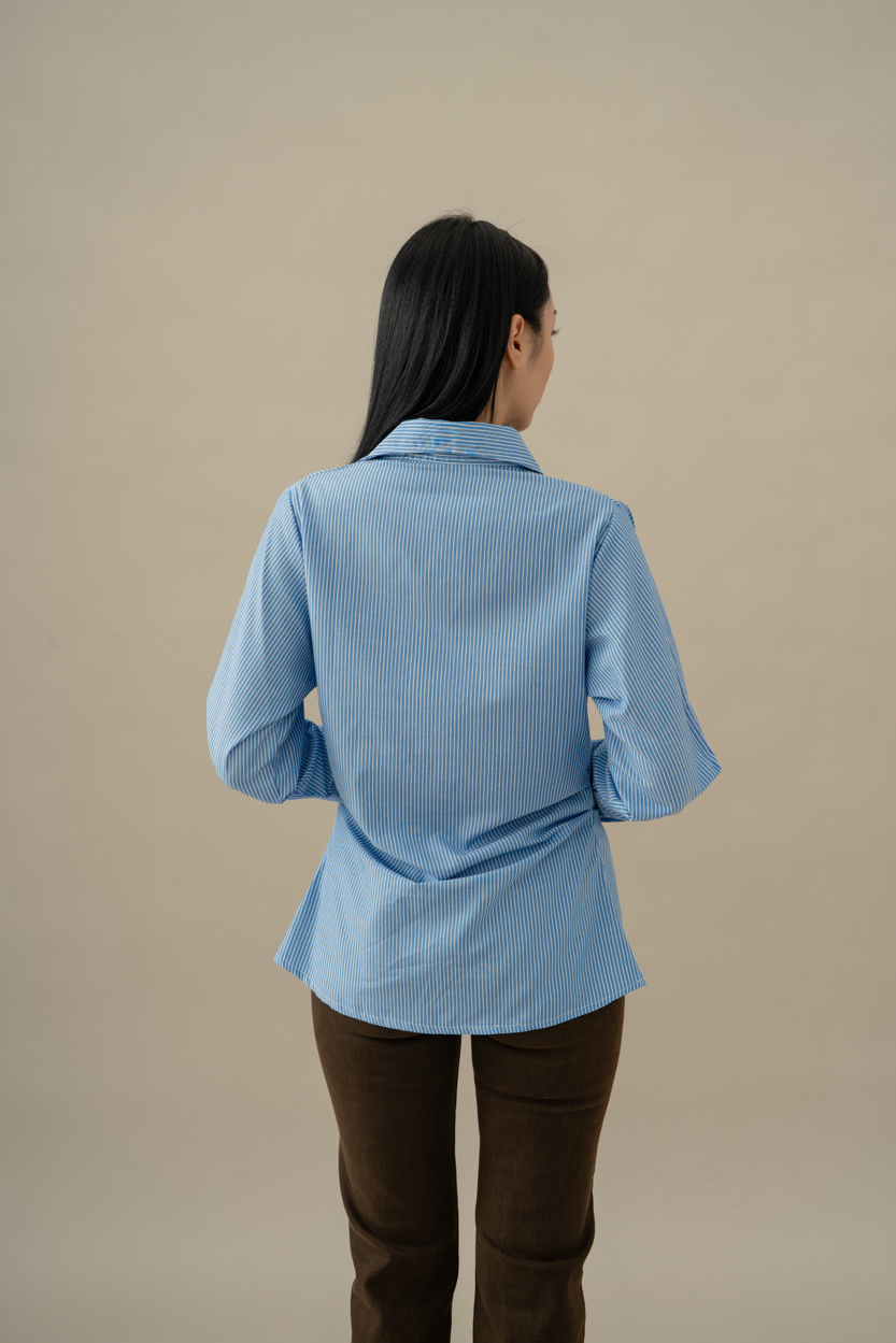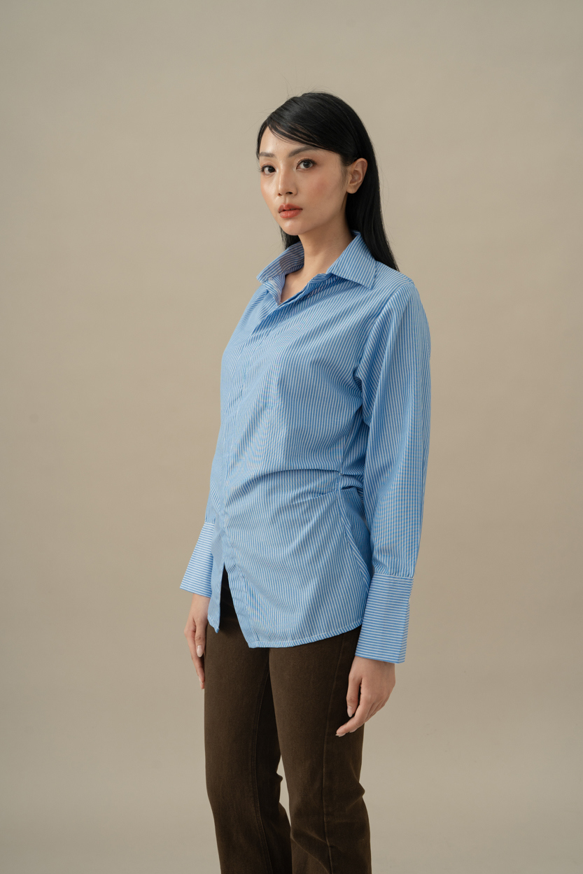 Material: Cotton A shirt with long sleeves, classic collar and buttoned cuffs,featuring draped detail on the side creates a flattering silhouette,comes in stripe and white