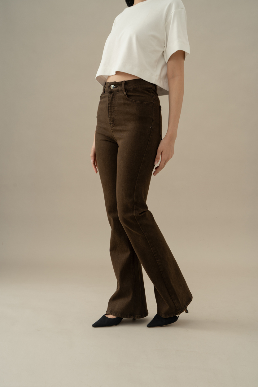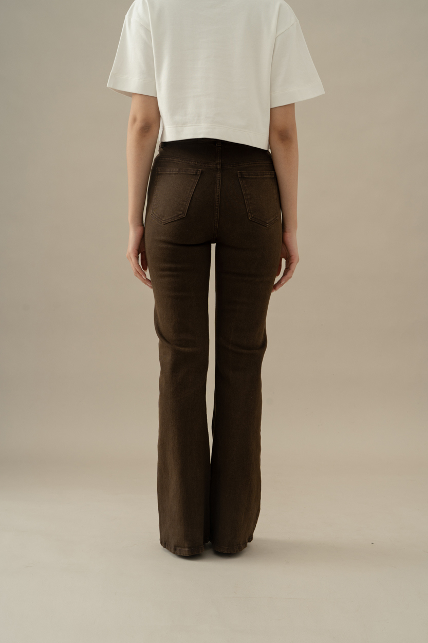 High-waist jeans with pockets, flared hem.Front zip fly and button fastening