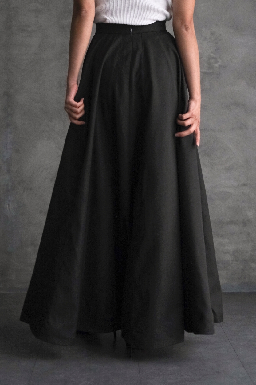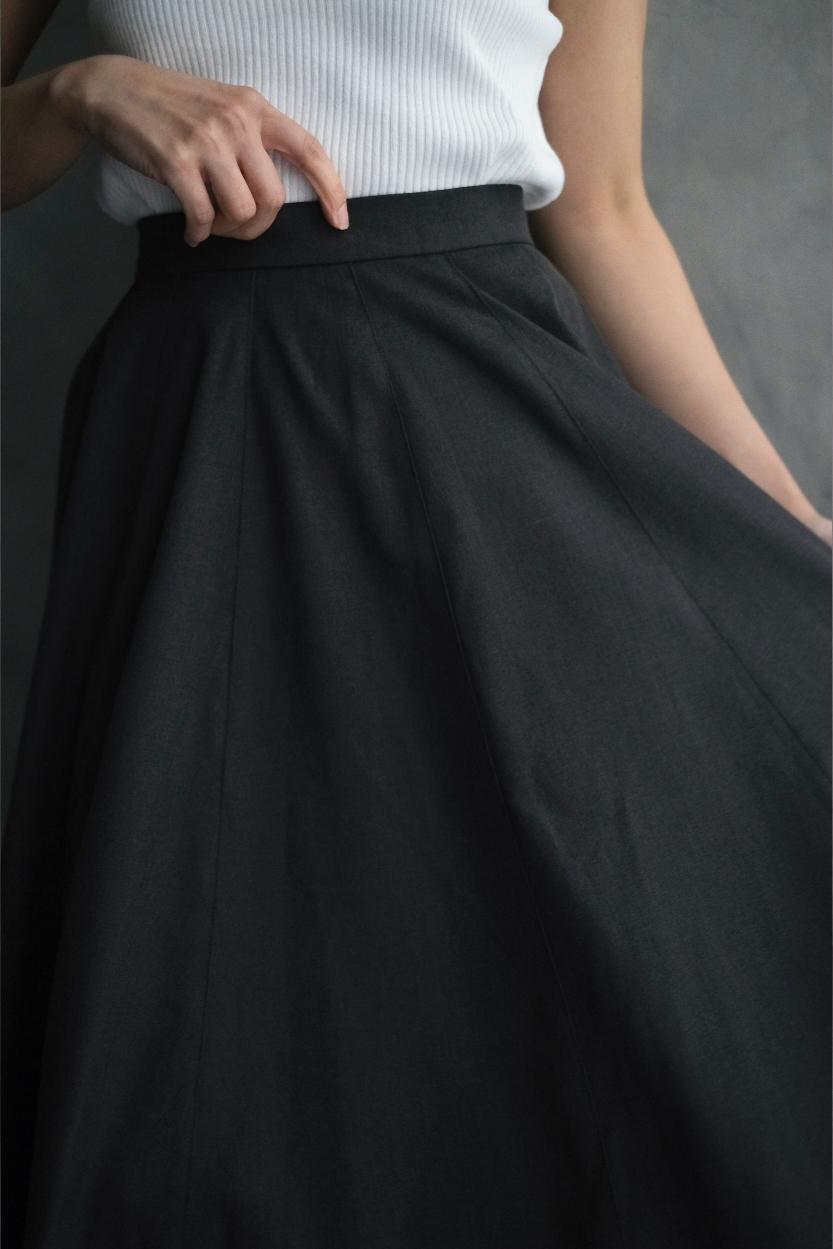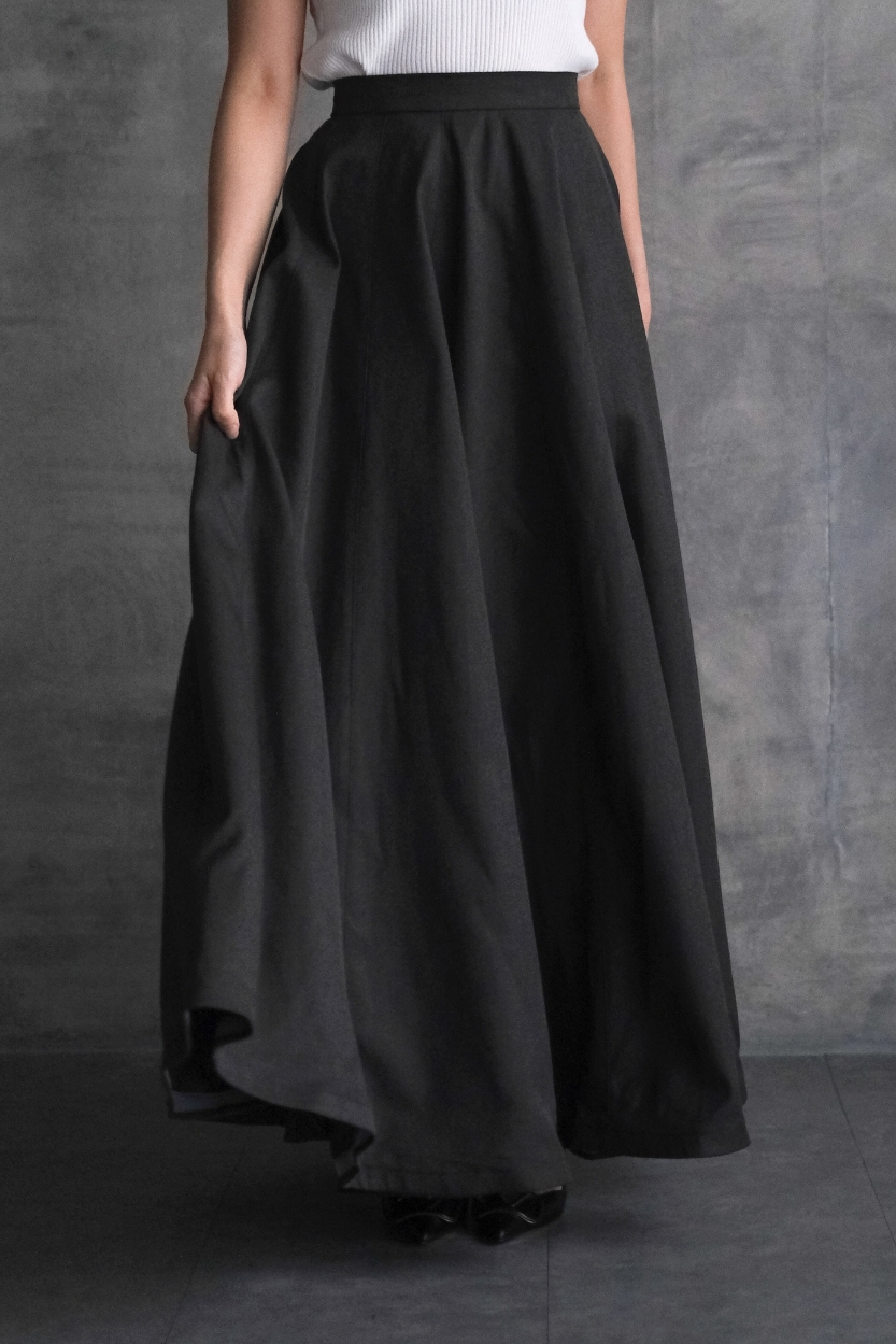 Material: Semi Wool Cotton High-waisted long flowy skirtComes with a concealed zipper at the center back and hook fastening