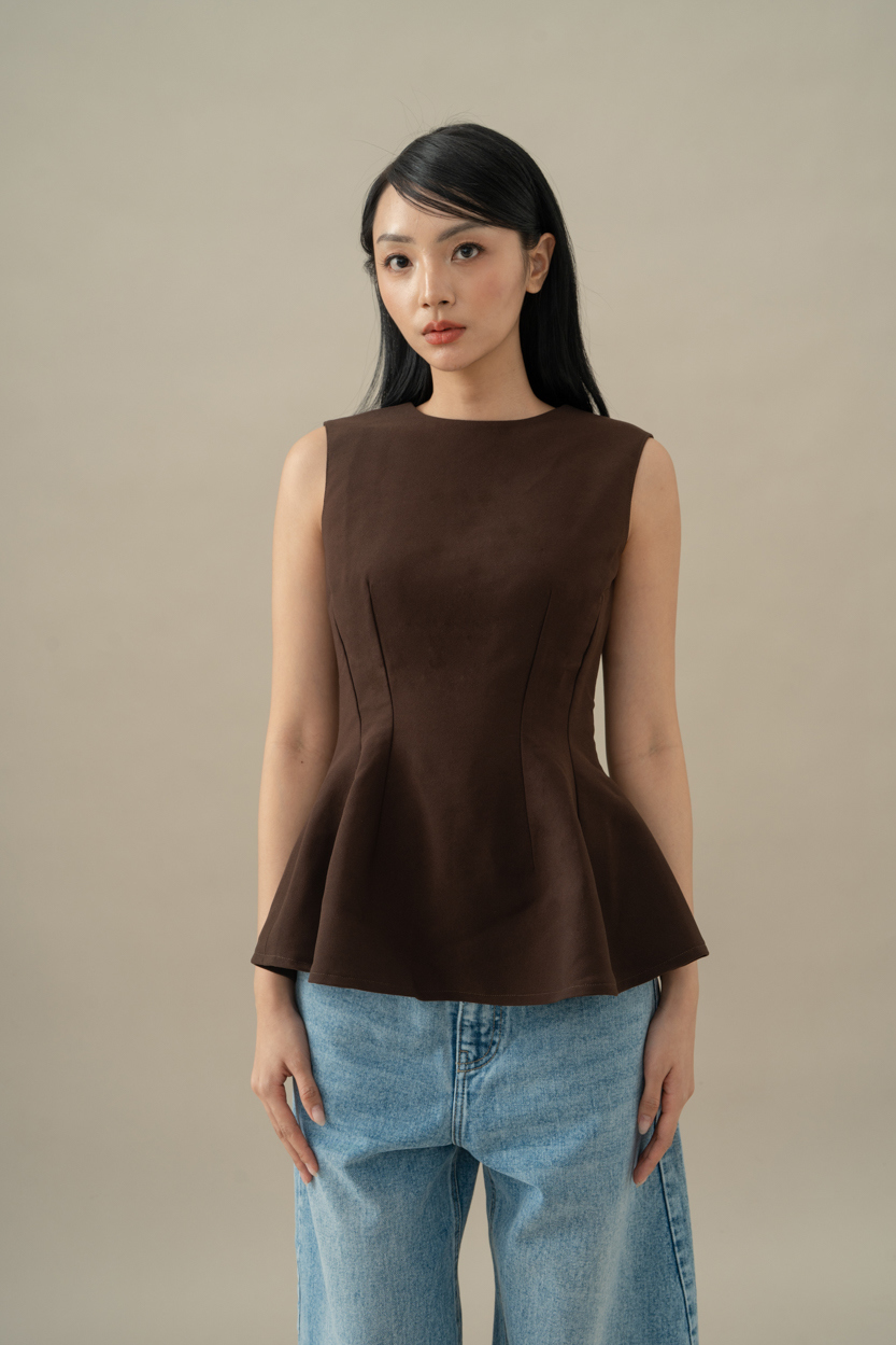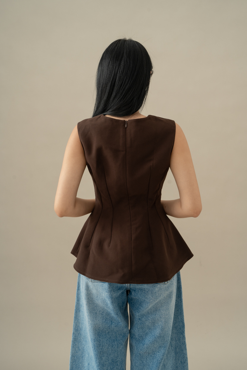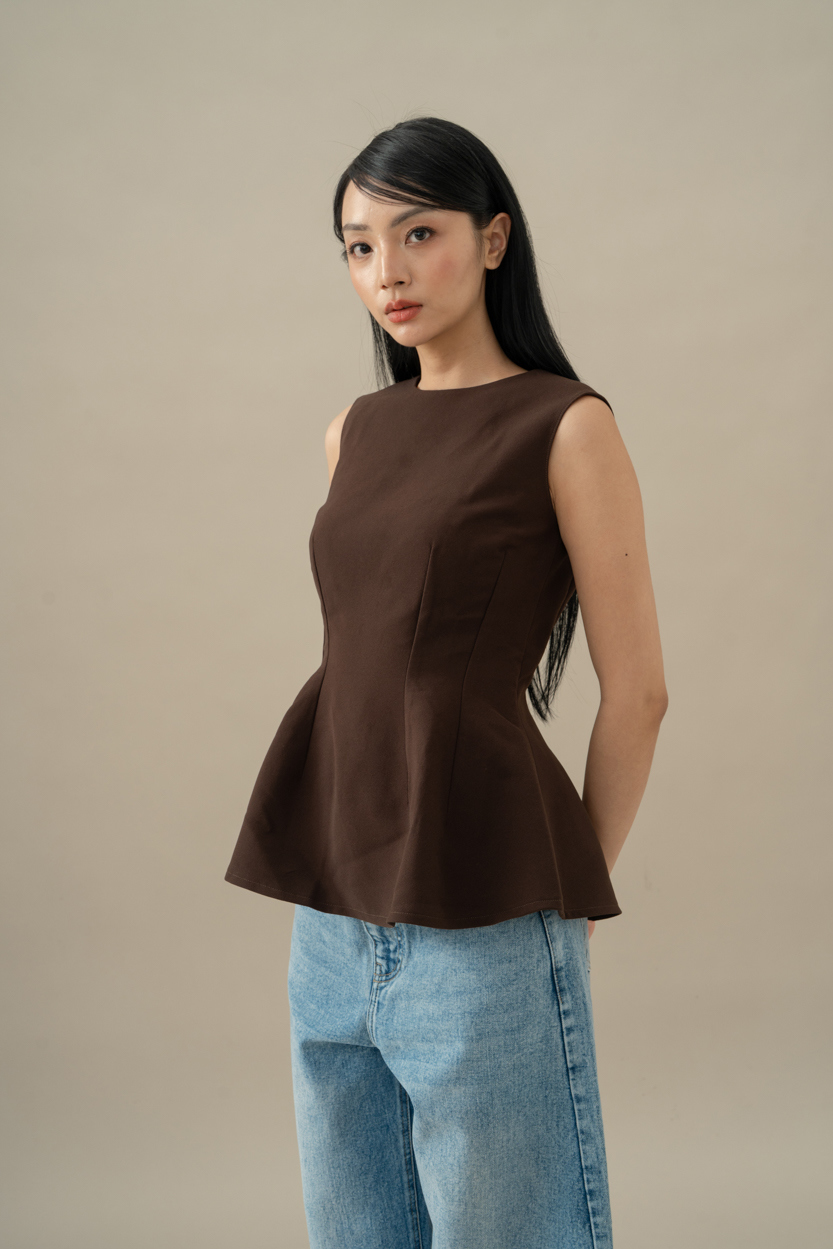 Material: Braga Crepe Round neck top with peplum-hemconcealed zip fastening at the backcomes in brown and white